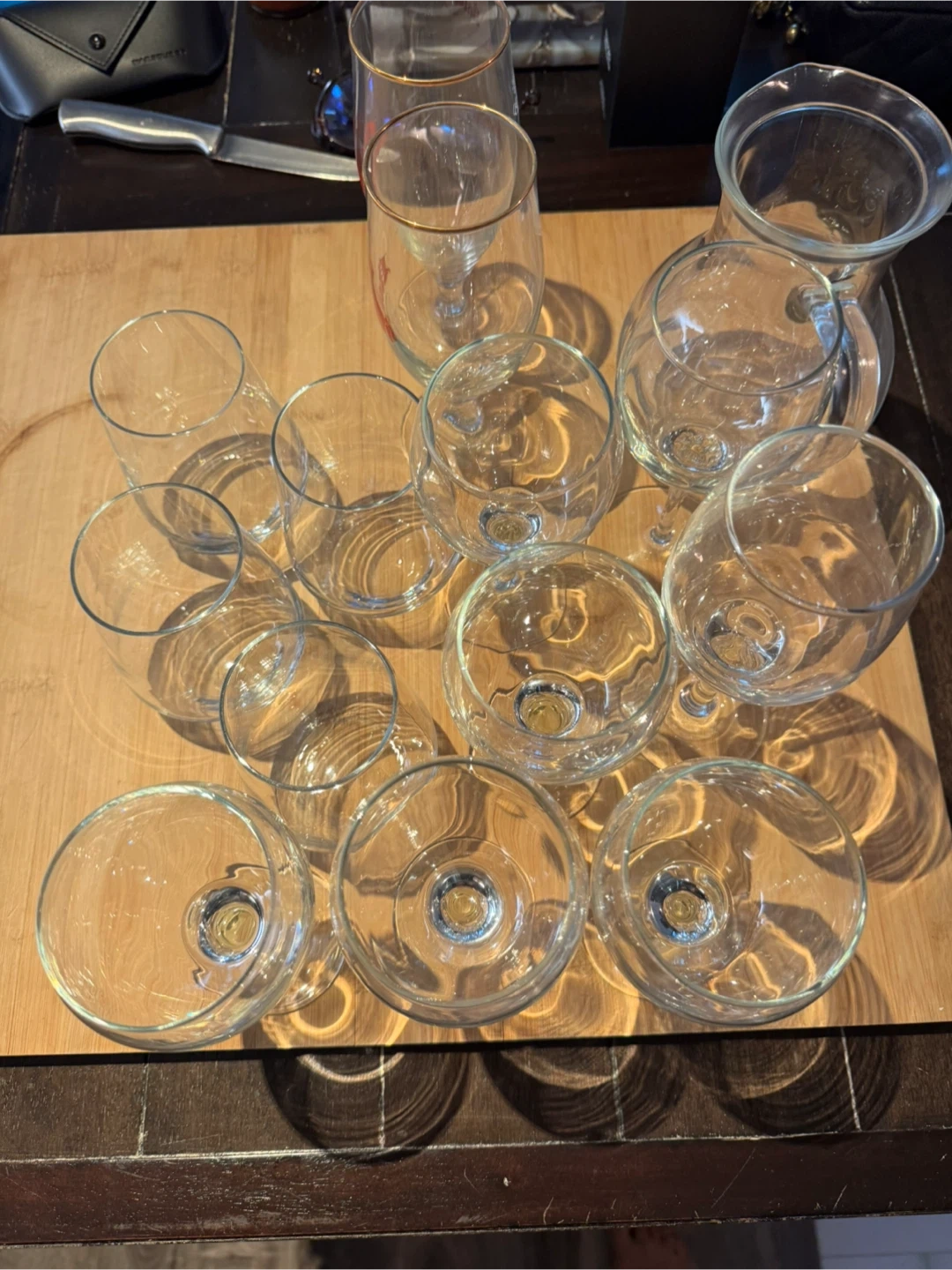 Selling a collection of glasses! There's a variety here, including wine glasses, water glasses, and a pitcher. Great for stocking up your kitchen or barware