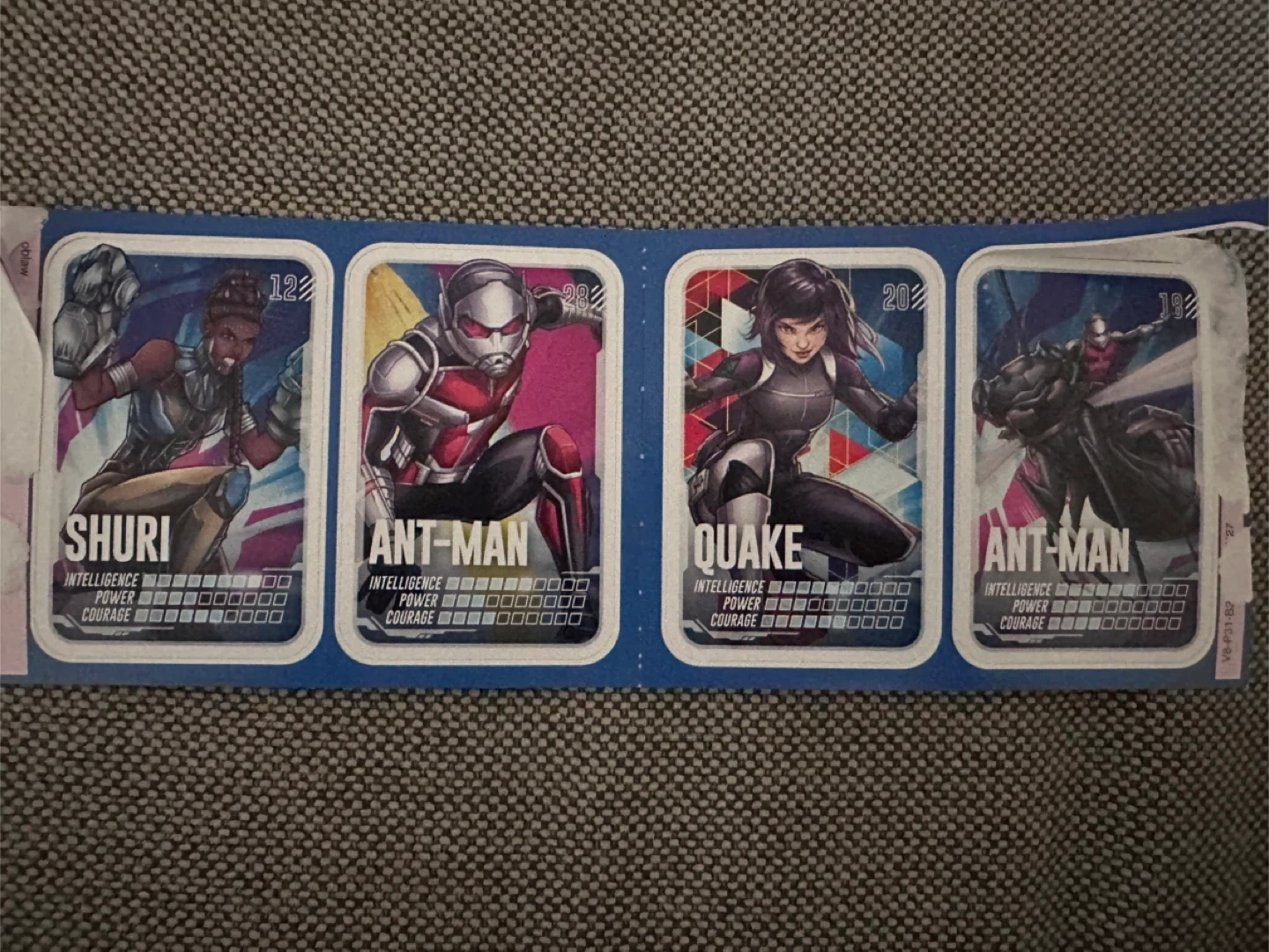 Selling a set of Marvel superhero trading cards featuring Shuri, Ant-Man, and Quake. Each card includes stats for intelligence, power, and courage. Great for any Marvel fan or collector!