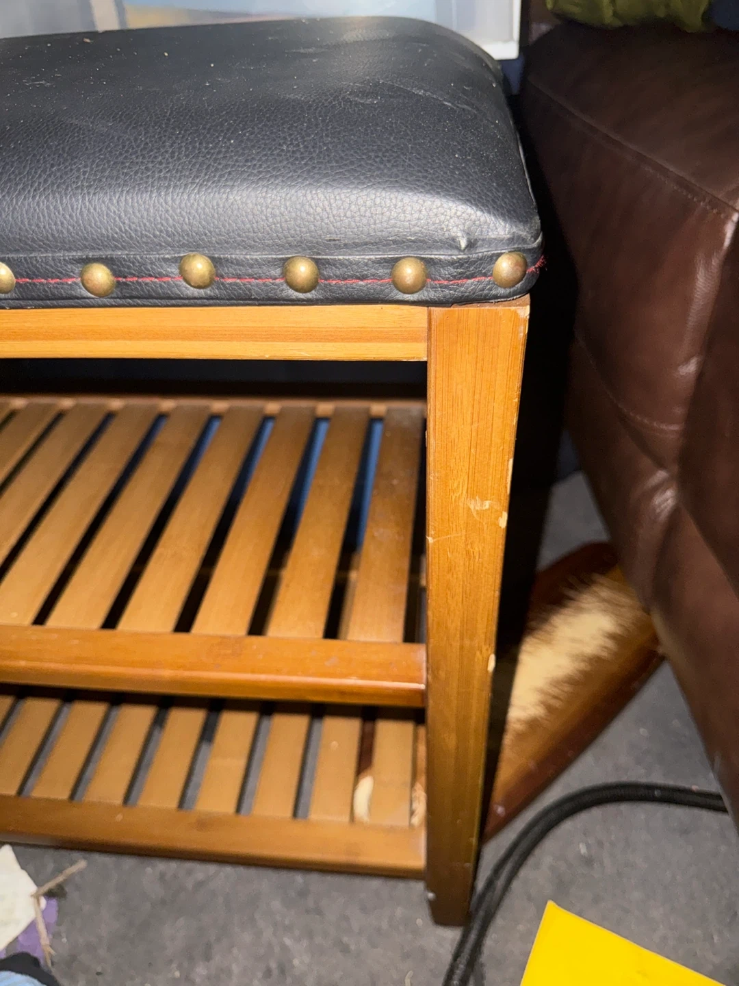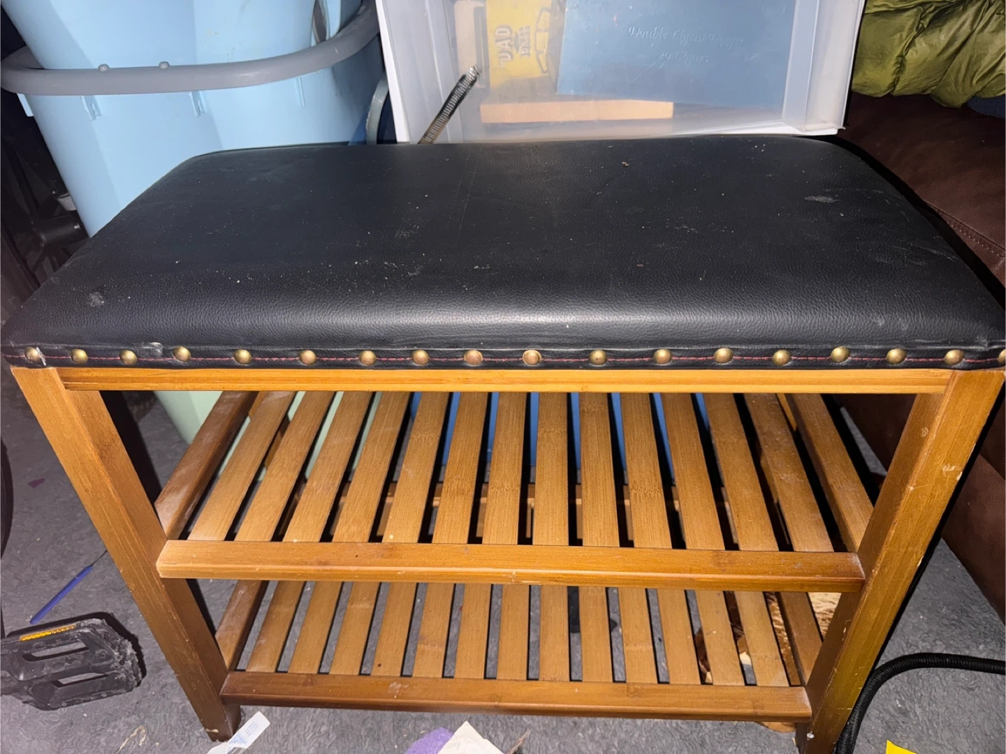 I'm selling a wooden shoe rack bench with a black cushioned top. It's perfect for entryways or closets to keep your shoes organized. The bench has a sturdy wooden frame and two shelves for storage. The cushioned top makes it a comfortable place to sit while putting on or taking off your shoes. It's in good condition and ready for a new home!