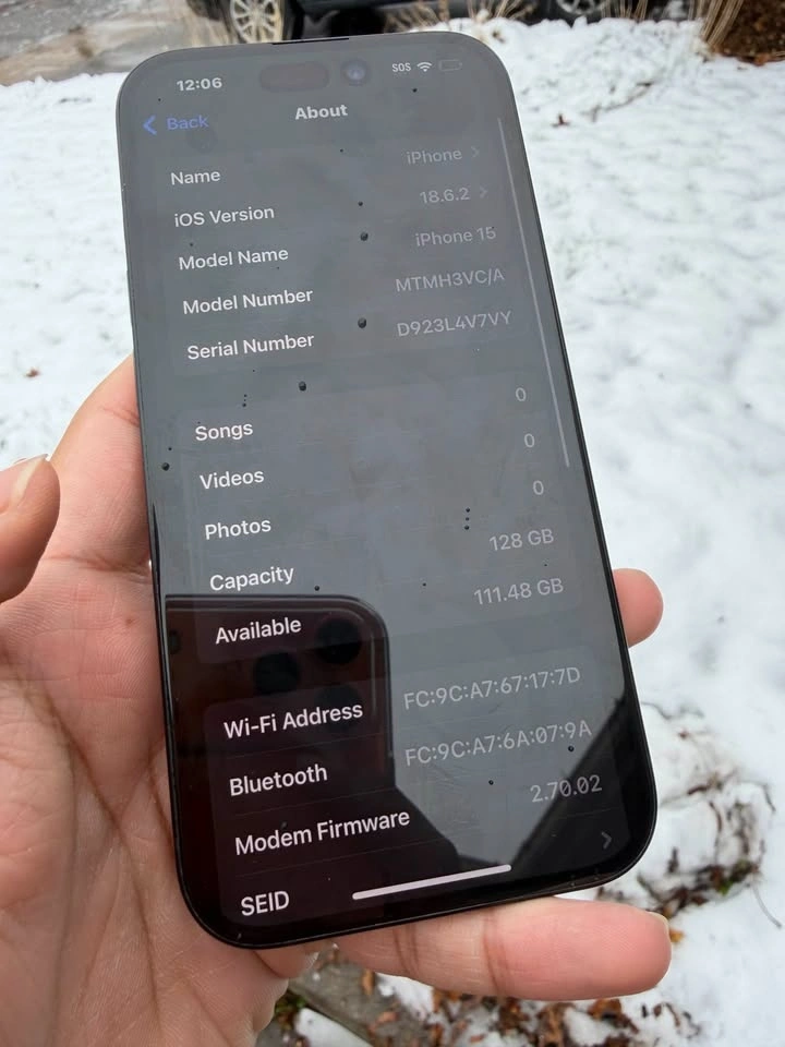 Fully functional iPhone 15 w/128GB with a battery life of 87%.