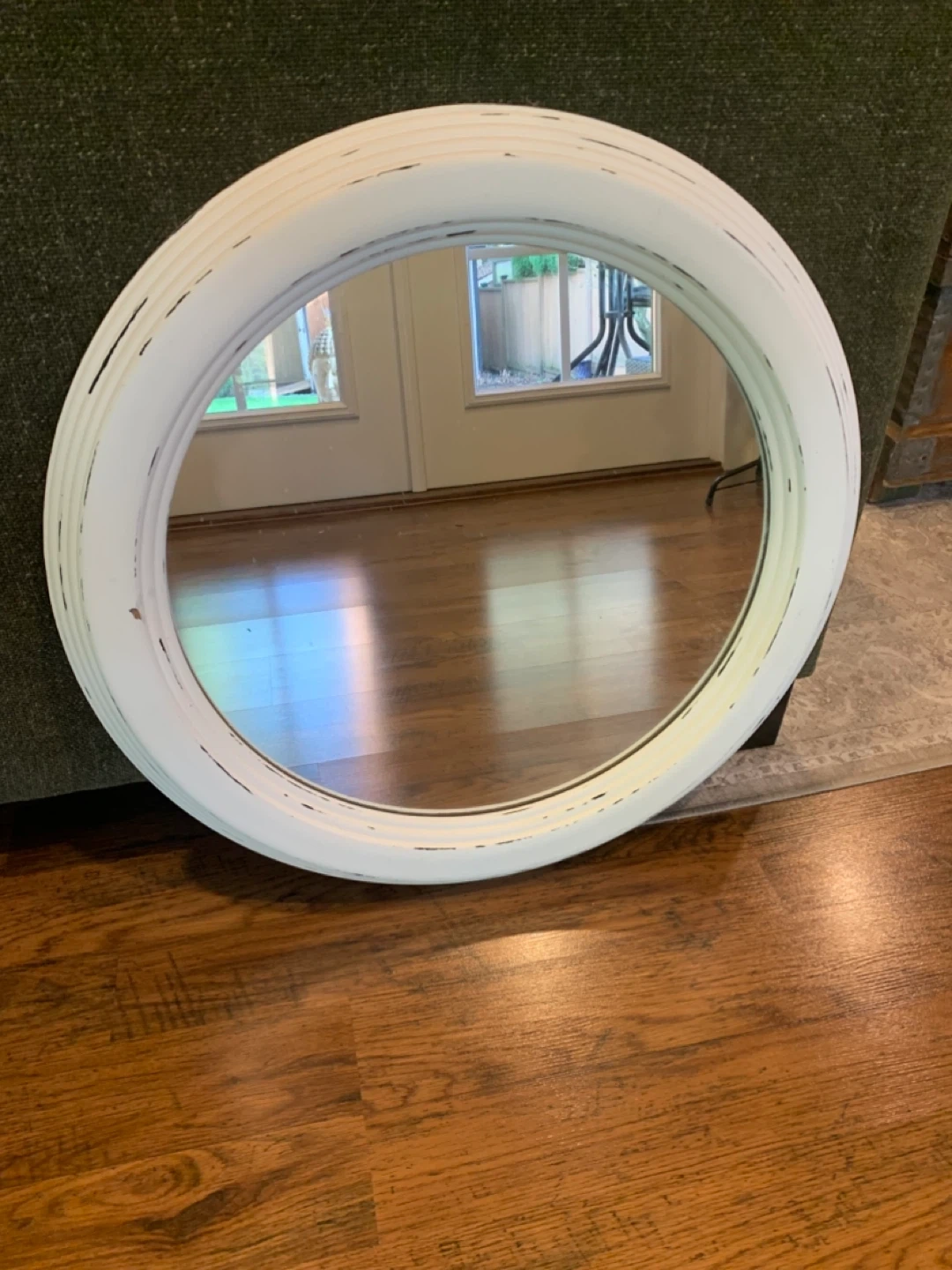 Selling a round mirror with a white frame. It's in good condition and would look great in any room of the house! 24” (2ft)