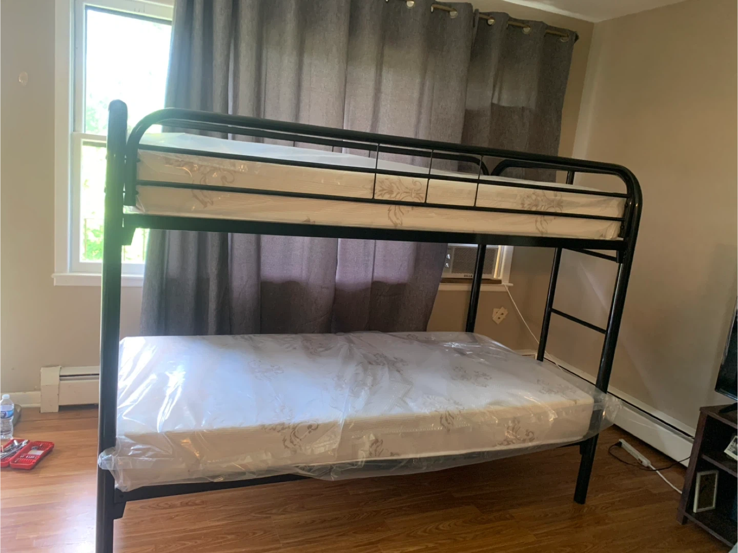 Selling a bunk bed frame that comes with mattresses. It's a practical solution for saving space in a shared room or accommodating guests. The frame is sturdy and the mattresses are included, so it's ready to set up and use right away!
