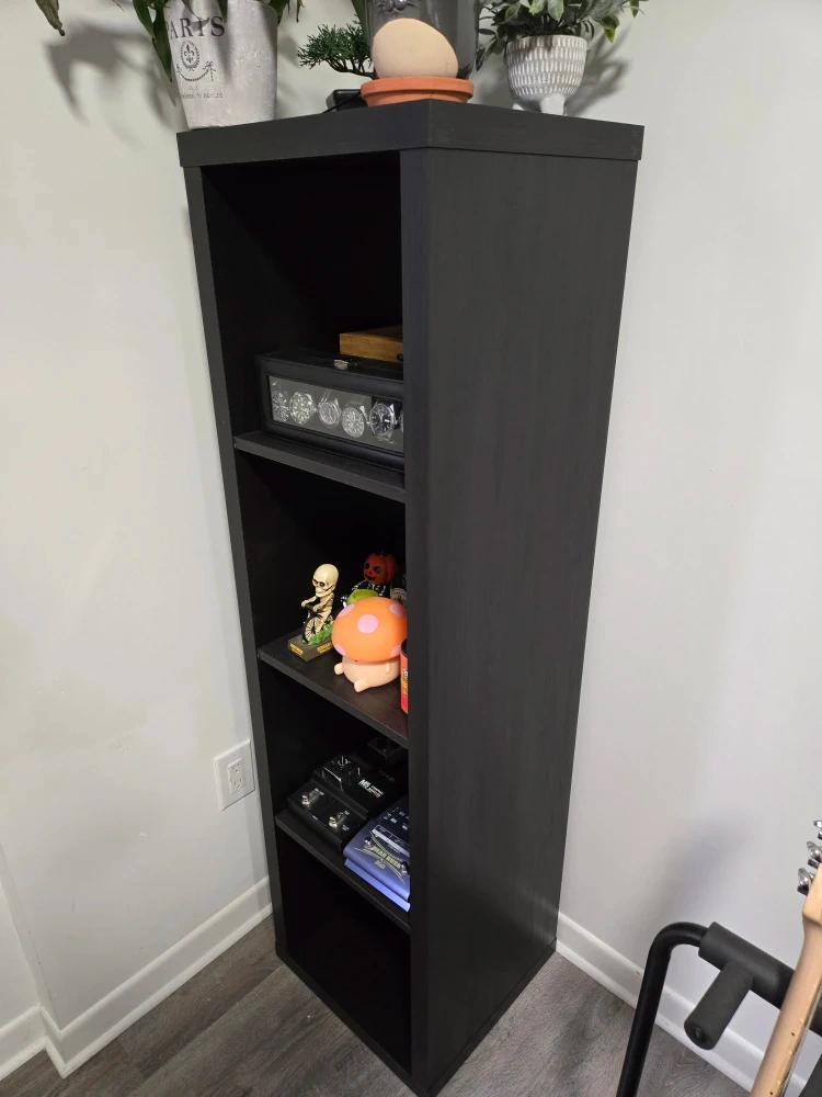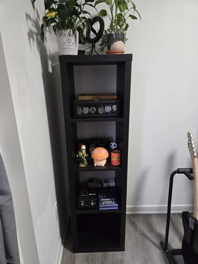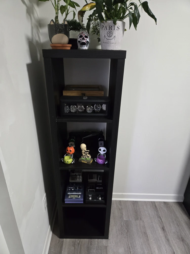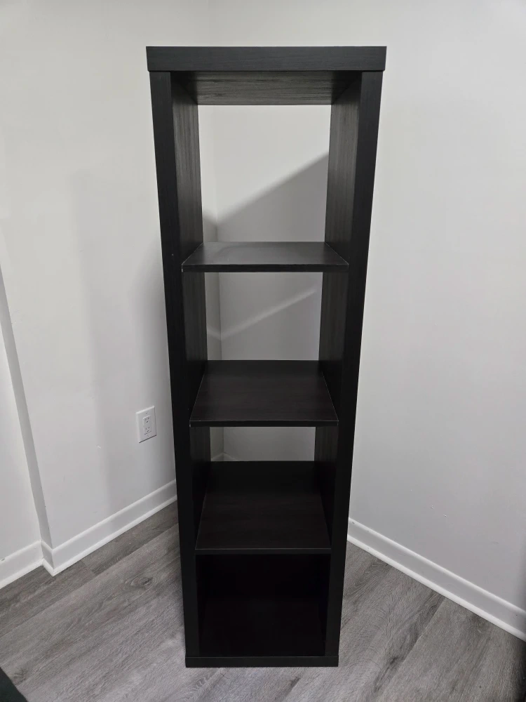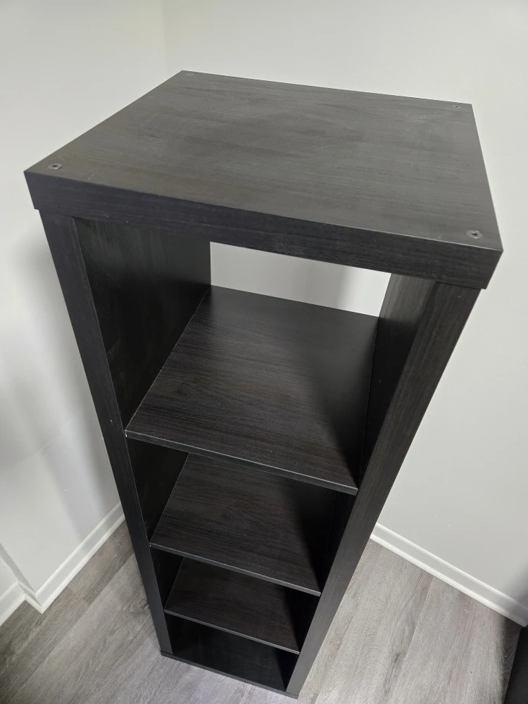 Selling an Ikea Kallax black wood shelf in great condition. It's perfect for displaying your favourite items or storing books and other essentials. Easy way to add some storage space.
