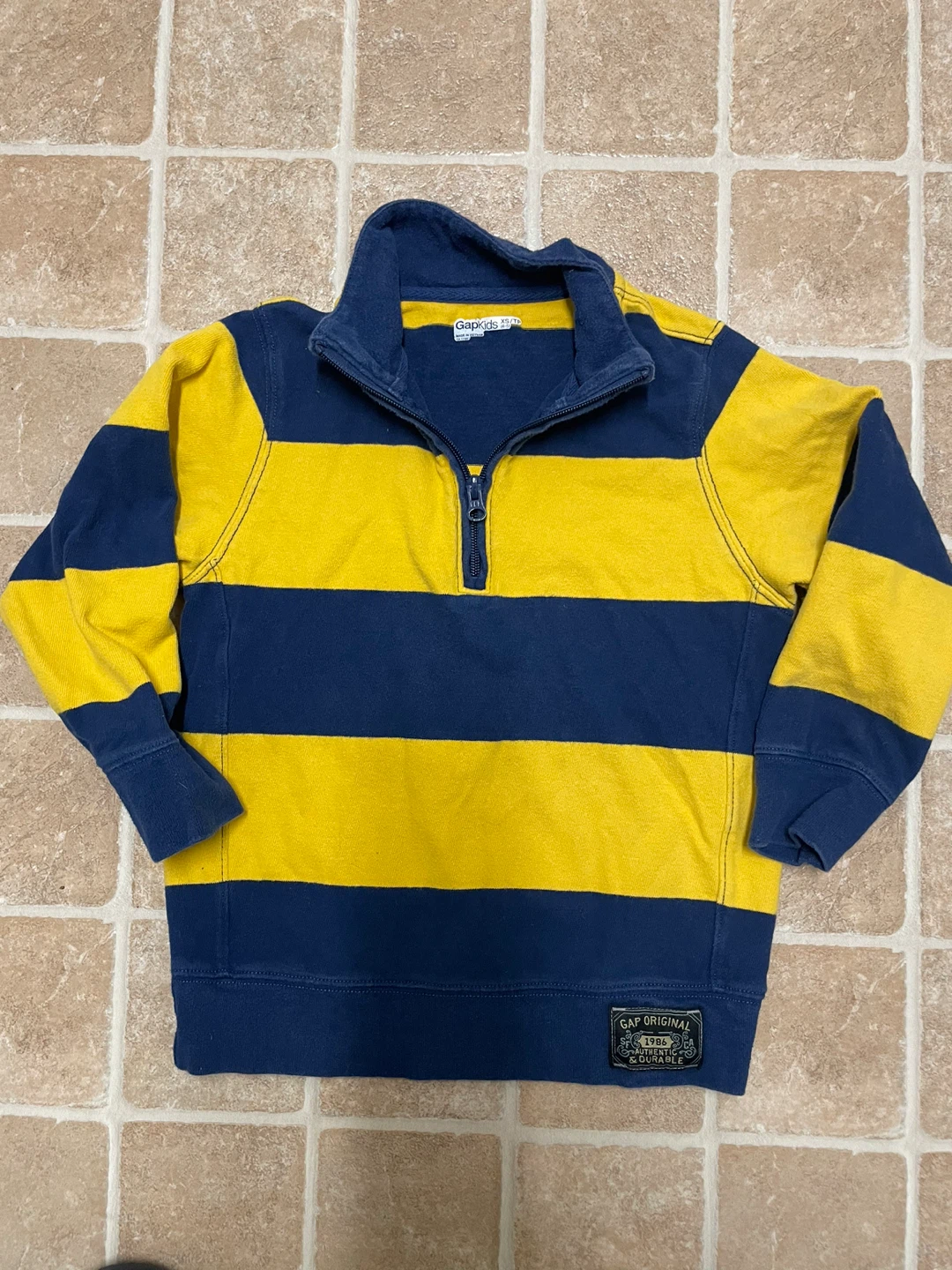 This is a cute Gap Kids pullover in size 2T. It features a classic striped design in yellow and blue. The pullover has a quarter-zip closure and is in good condition. Perfect for keeping your little one warm and stylish!