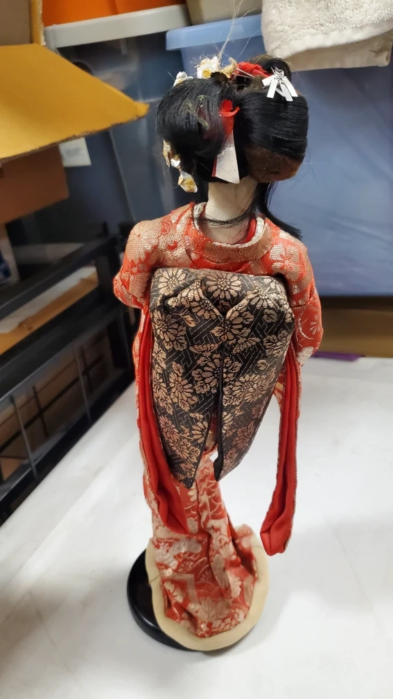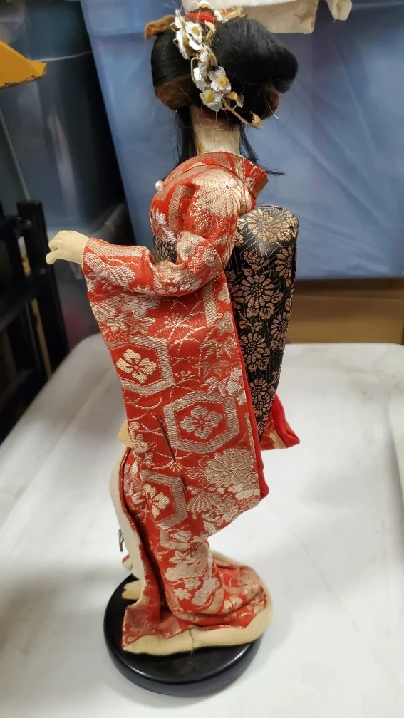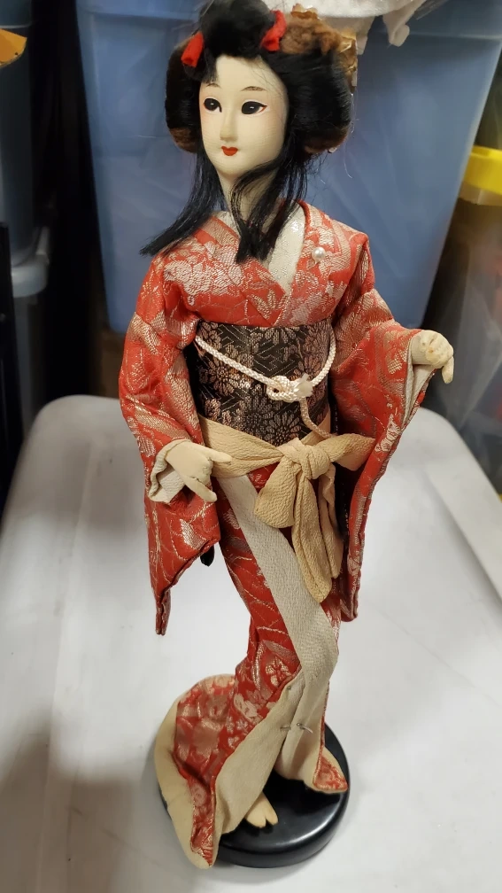 Selling a vintage Japanese Geisha doll. It's dressed in a traditional red and gold kimono with intricate floral patterns. The doll has a black base and detailed hair styling. It's a beautiful piece for collectors or as a decorative item!