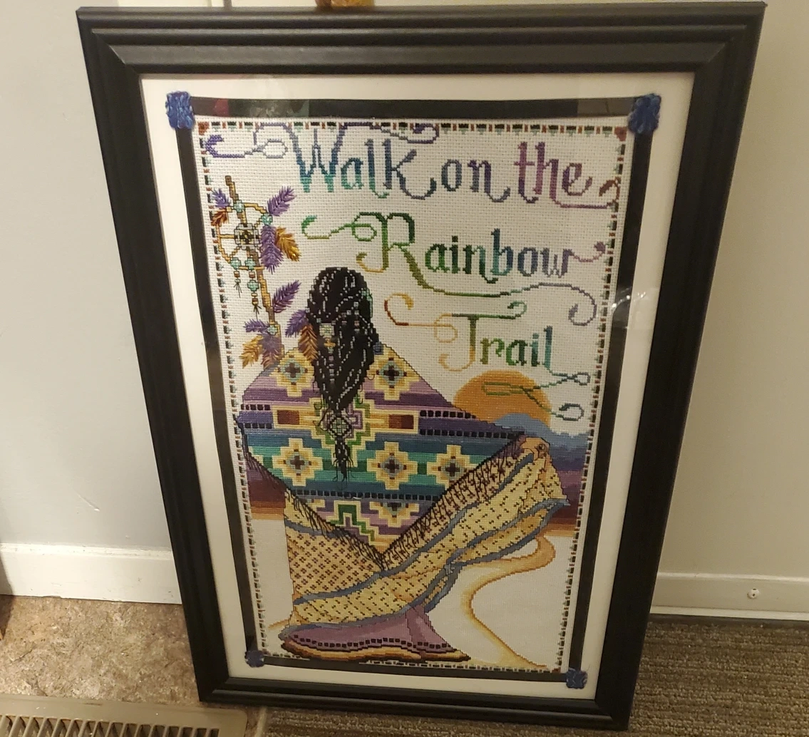 Here's a beautiful framed cross stitch piece. It features a colorful design with the words "Walk on the Rainbow Trail". It would make a lovely addition to any room! One of a kind!