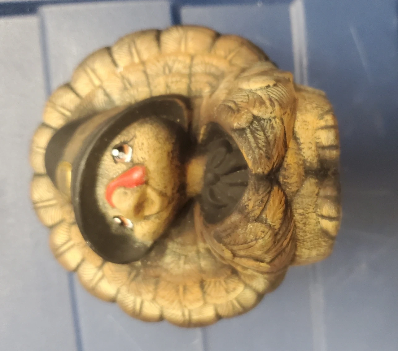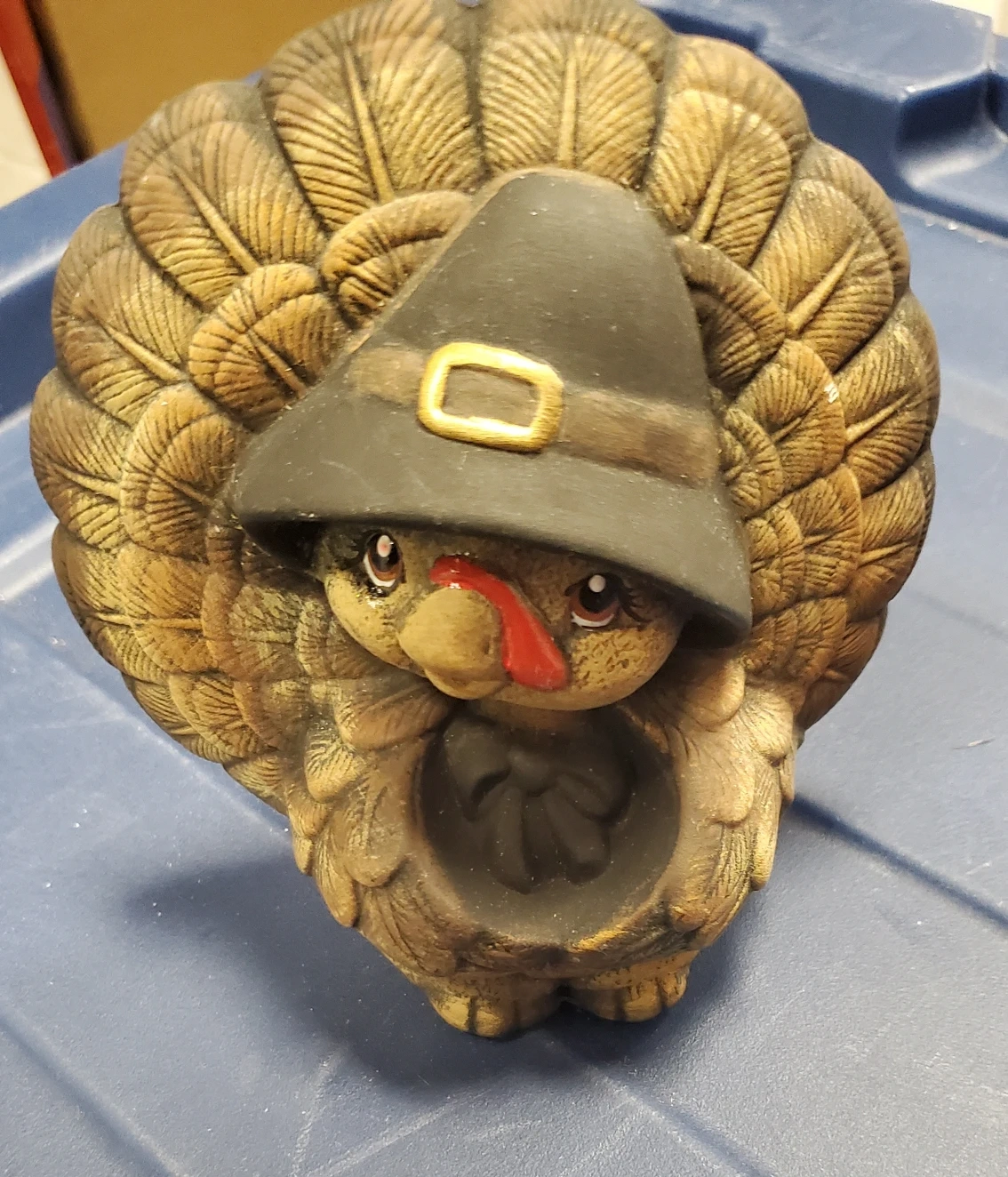 Here's a cute Thanksgiving turkey figurine! It's wearing a pilgrim hat and has a sweet expression. It's in great condition and would make a nice addition to your holiday decorations. About 5 inches tall.