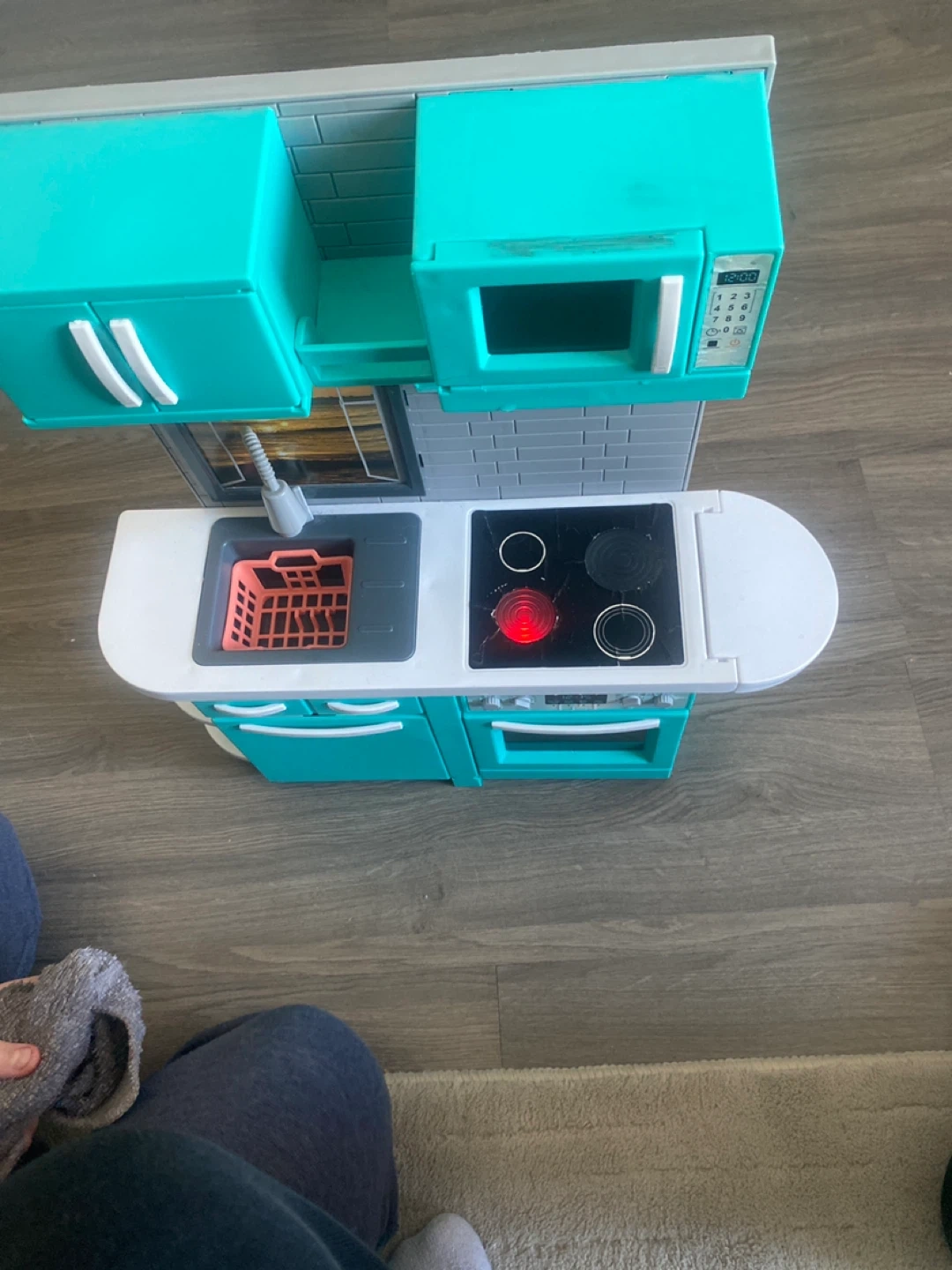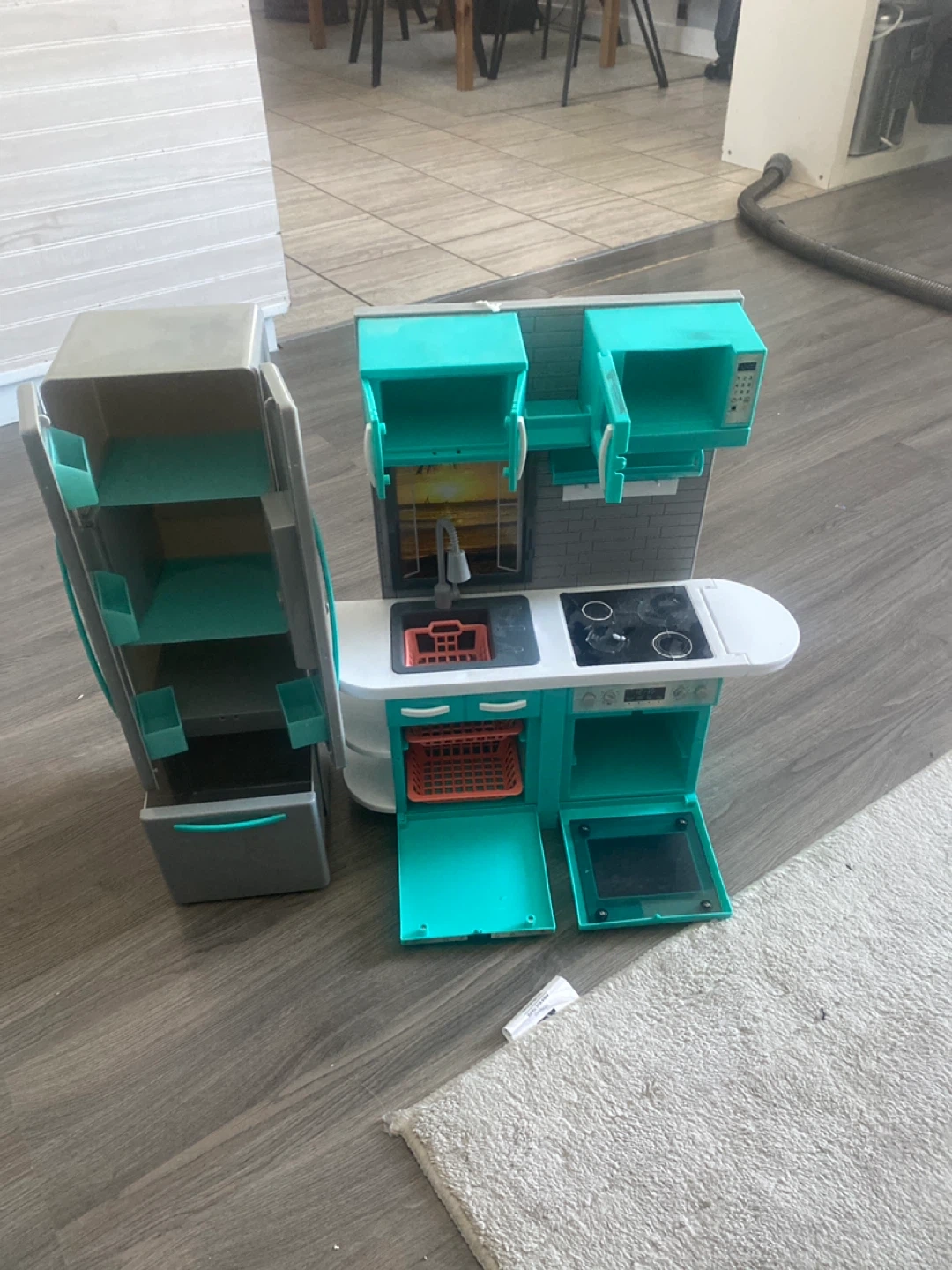 A fun toy kitchen and refrigerator set for your little one! It's in great condition and ready for hours of imaginative play. The set includes a kitchen unit with a sink, stove, oven, and microwave, as well as a matching refrigerator. It’s ready for a new home. The stove lights up and makes sounds like it’s cooking. My daughter has out grown it.