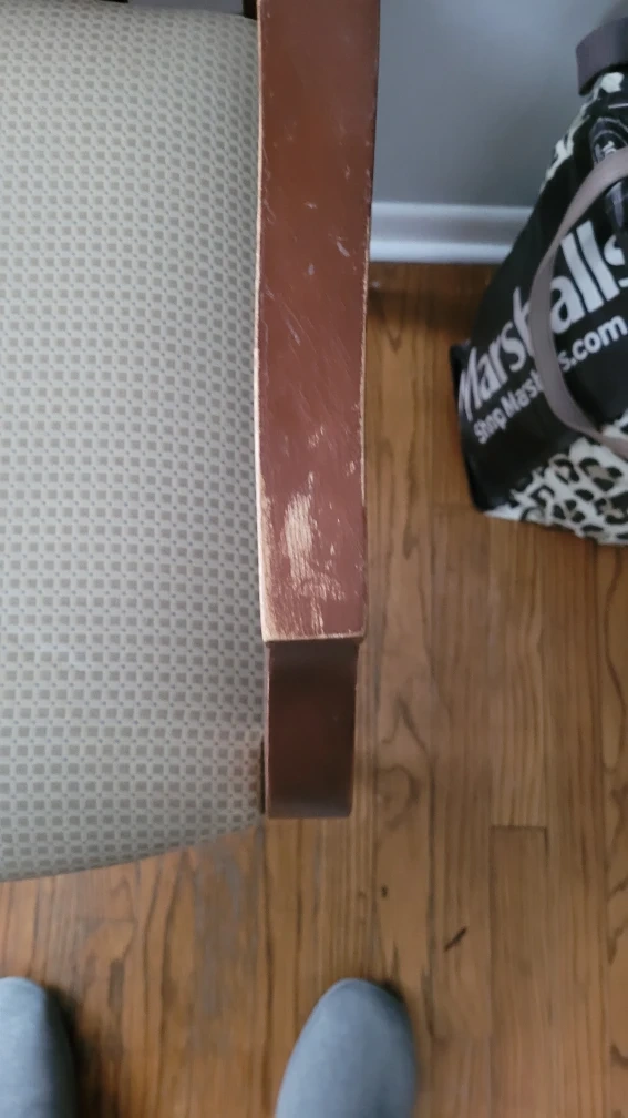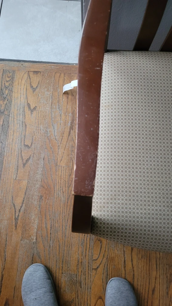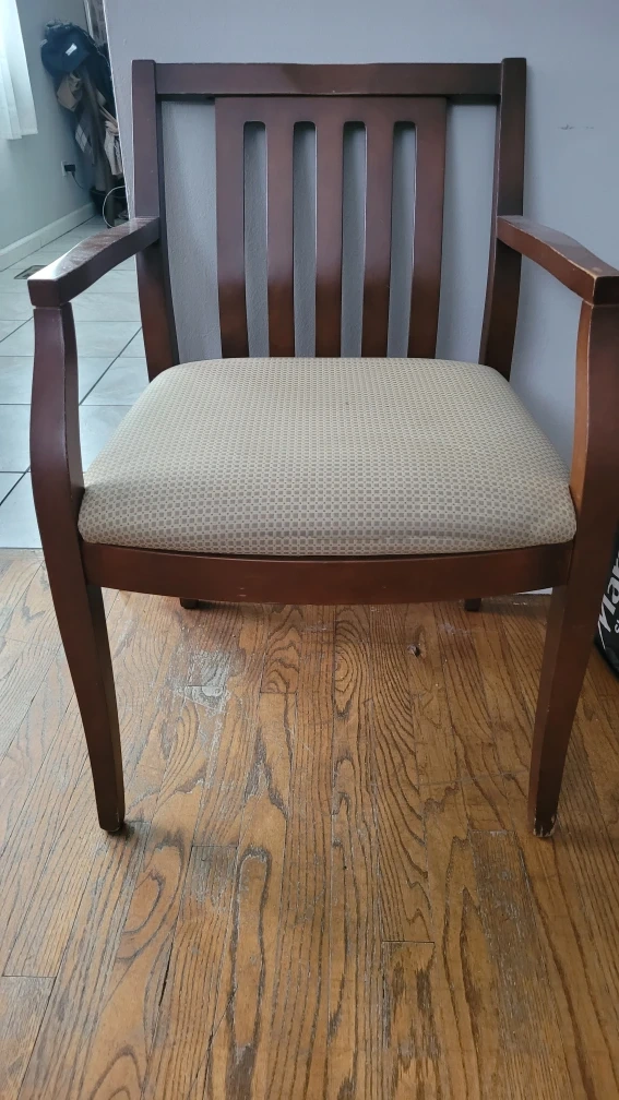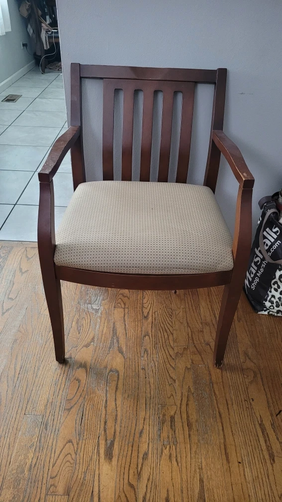 Selling a wooden armchair with a patterned seat. It has a brown frame and a neutral-colored cushion. There are some signs of wear on the arms, as shown in the photos.