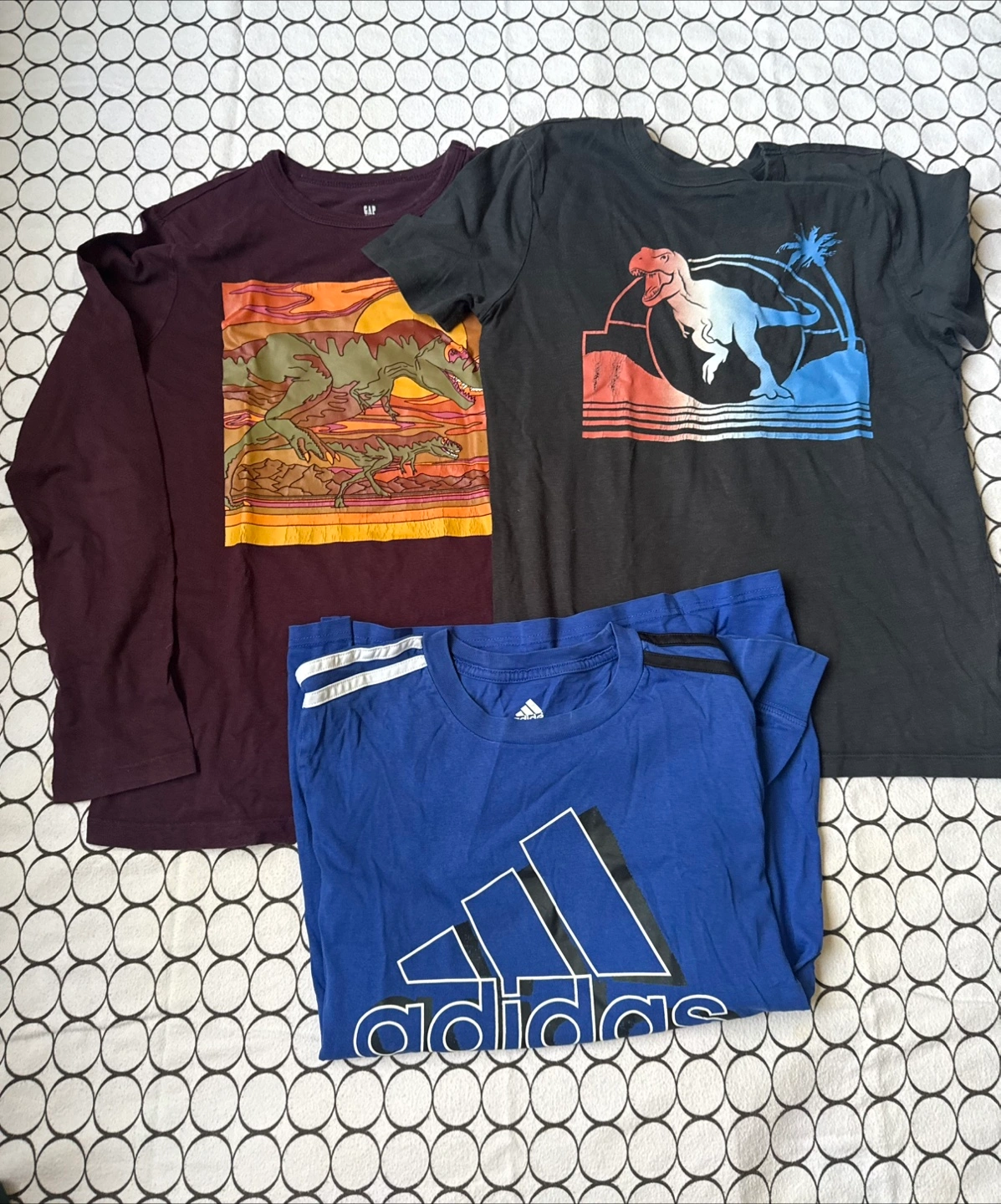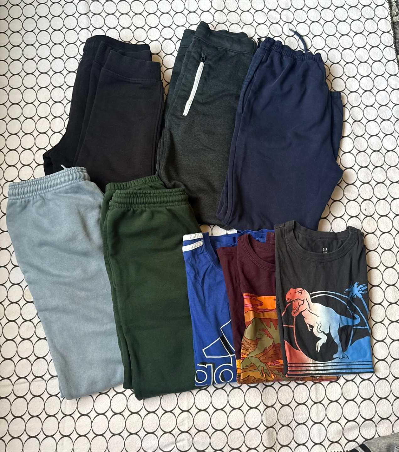 Selling a bundle of kids sweatpants and t-shirts! 3 gap blue wash size 12 like new, green gap size 10 VGUC, dark blue gap good condition. Hurley size L in good condition except knee damage as shown in photo. Spider size 10 in fair condition . Adidas blue long sleeves in good condition two gap short sleeve in good to fair condition.. smoke and pet free home.