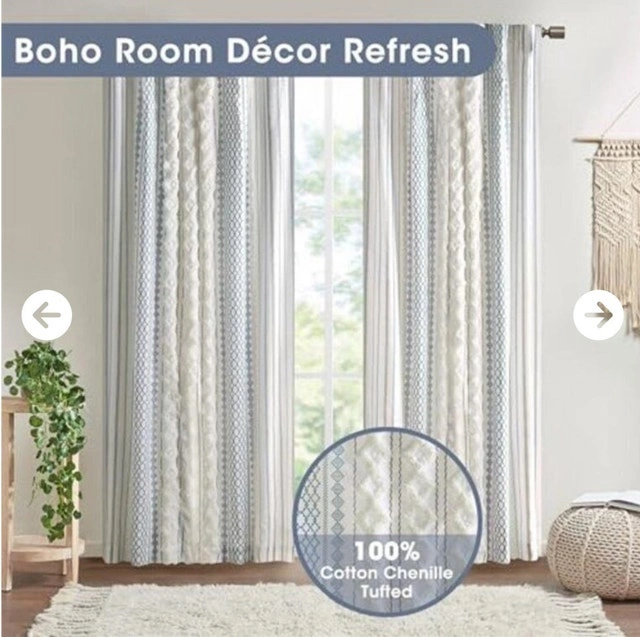 Add a touch of bohemian flair to your bedroom with this single panel INK+IVY Boho Curtain, perfect for a living room window! This curtain features 100% cotton tufted chenille stripes in a modern farmhouse style. It gently filters light, creating a soft and inviting ambiance. Measuring 50" x 84" with an ivory and navy colour scheme. This curtain is in used condition, please see photos for details. I'm pricing it at $15. If the ad's up, it's up for grabs!