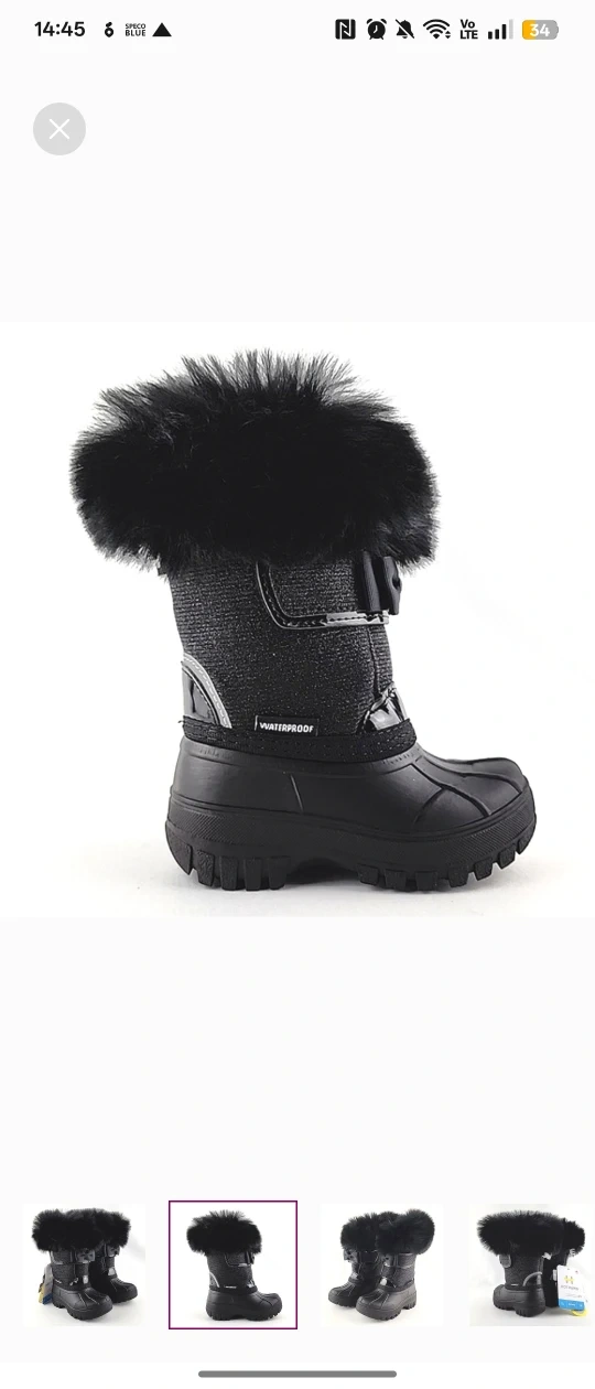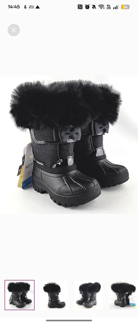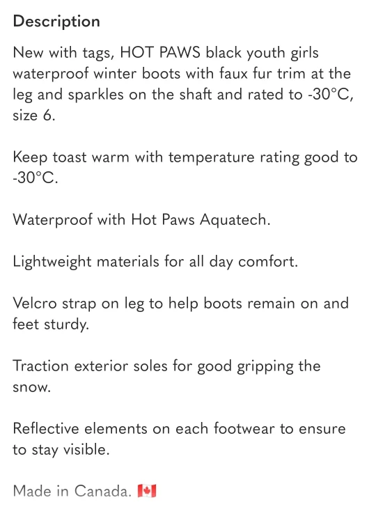 These HOT PAWS black youth girls winter boots are brand new with tags! They're waterproof and feature faux fur trim at the leg, plus sparkles on the shaft. Rated to -30°C, they'll keep toes warm and comfy. They also have a Velcro strap on the leg to help the boots stay on, and traction exterior soles for good gripping in the snow. Reflective elements on each footwear ensure visibility. Size 6