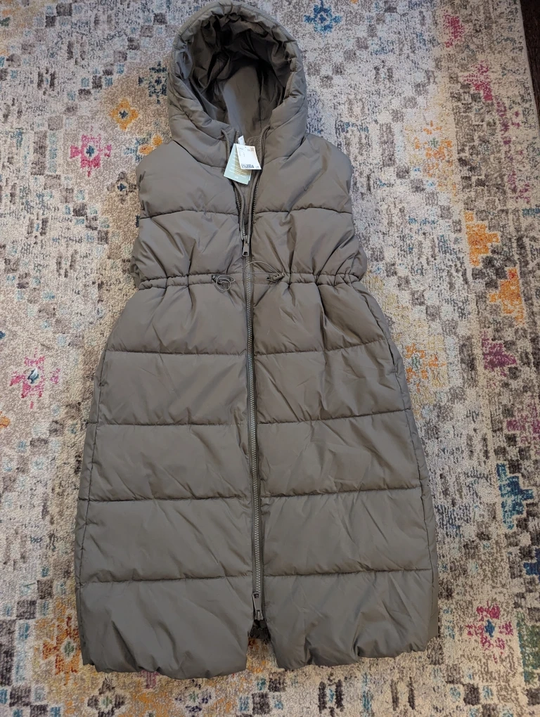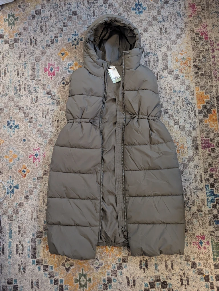 Selling a never worn, brand new women's H&M puffer vest in size L! It's a stylish and cozy piece, perfect for layering during cooler weather. The vest features a hood and a zipper closure. It's in perfect condition and ready for a new owner.