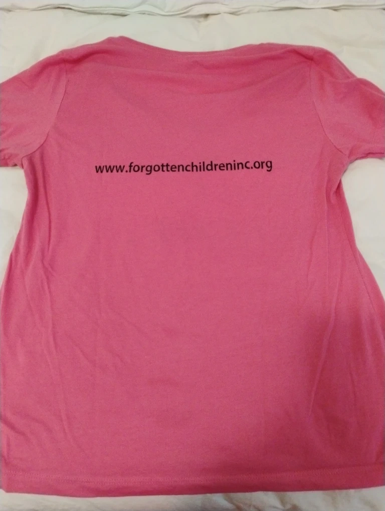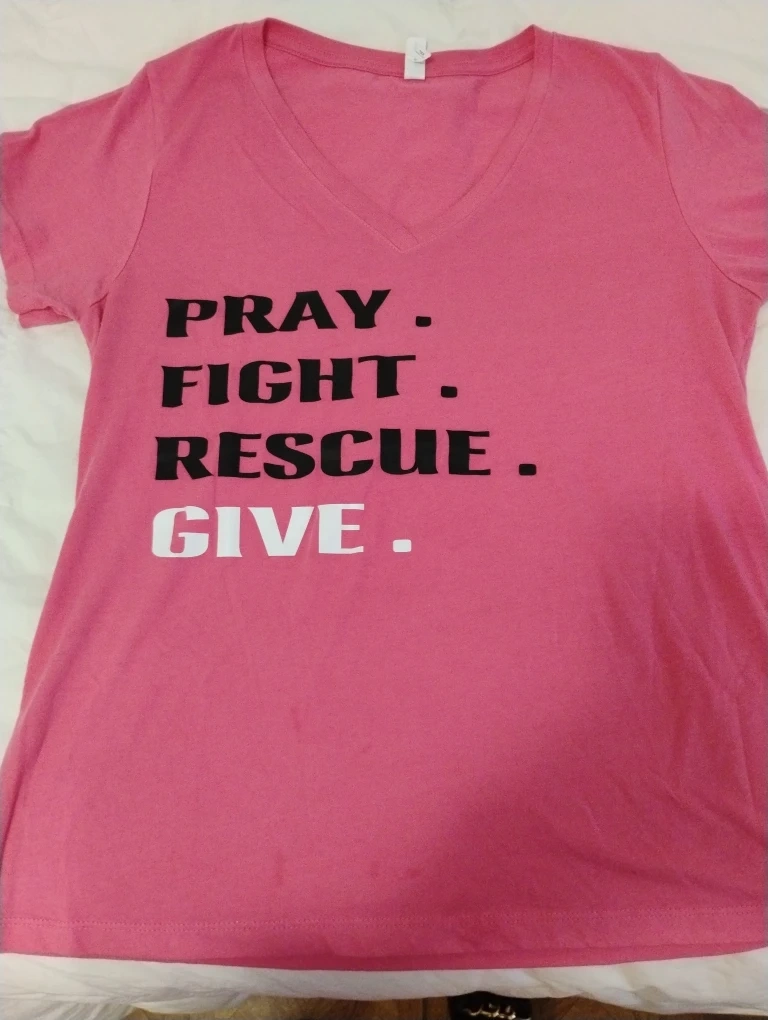 FREE 😊Pink T-shirt with "Pray Fight Rescue Give" printed on the front. The back has the website www.forgottenchildreninc.org printed on it. It's in great condition!