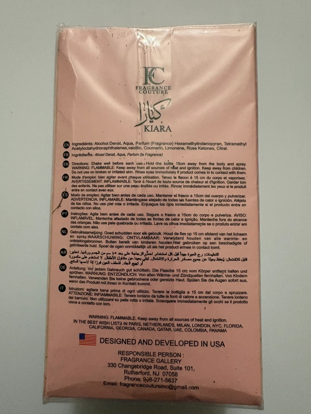 Selling a Fragrance Couture Kiara Eau de Parfum. It's a natural spray with a vaporisateur. The size is e100ml or 3.4 fl.oz. The box is included!