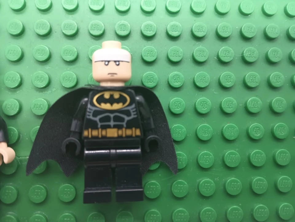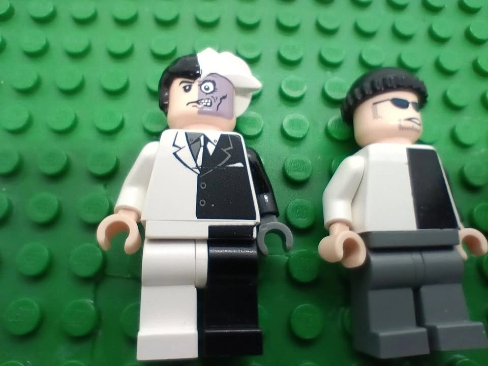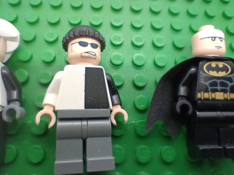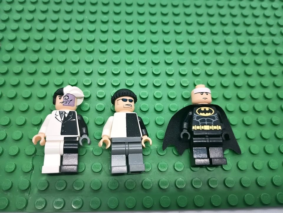 Very rare Lego Two-Face minifigure (bat004) with black stripe hip and two other minifigs from Lego Two-Face's Escape set 7781. The Two-face minifigure has what looks like a slight imperfection in its printing on the chest area at the bottom end of the tie (not a scrape or scratch from what I can tell, so may have been a factory print blemish). The other minifigures are two-face's henchman and Batman (Batman is missing his wide ear mask Lego part number 55704). From a SF/BF home in Charleswood.