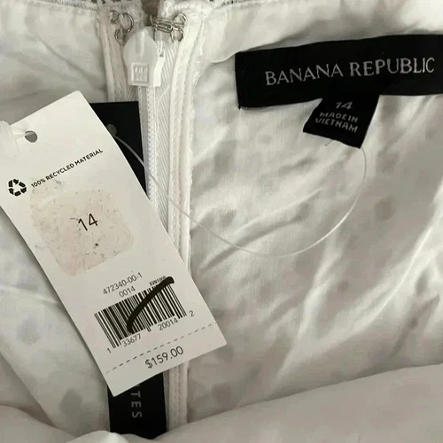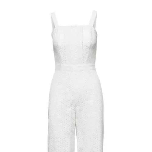 Brand new with tags Banana Republic white eyelet cropped jumpsuit in a sz 14. Fitted through the shoulder, chest and waist. Relax through the hip and thigh. Wide leg cropped length. Square neck wide straps. Invisible zipper at back. Ribbon waistband. Lace accent at the bodice. Fully lined in soft breathable cotton lawn. Inseam 21”. Leg opening 24”. Material: Shell and lining 100% Cotton. Made in Vietnam. Excellent condition comes from a smoke free pet free home.