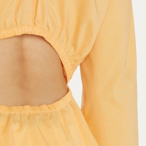 Brand new with tags. Front V-neck. Elasticized cutout back with ruffle detail. Dropped shoulder. Long bell sleeves. 16 1/2" armpit to armpit. 23" shoulder to hemline. Material: 100% cotton. Excellent condition except for hole. It comes from a pet free smoke free home.