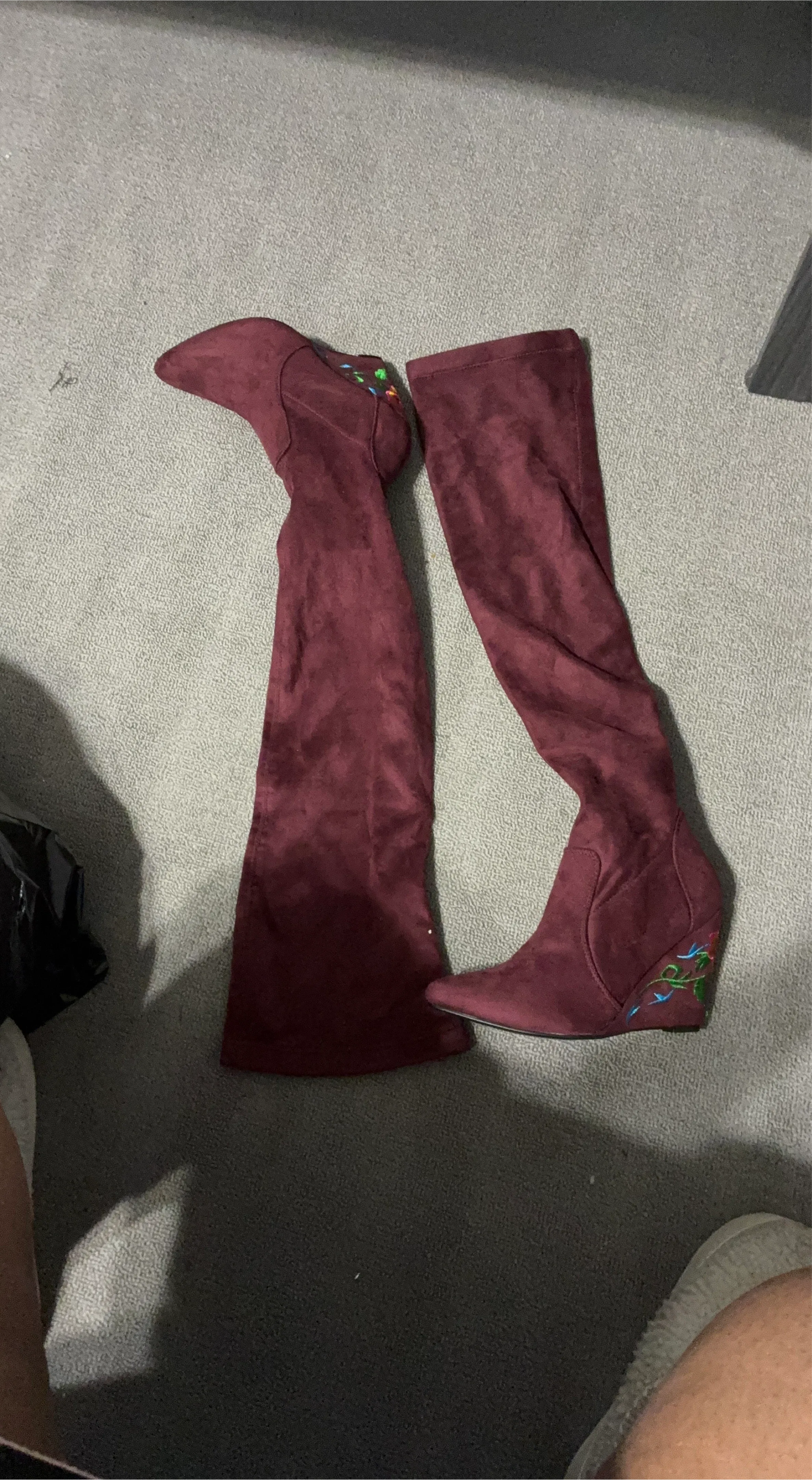 Selling a pair of burgundy thigh-high wedge boots! They feature a pointed toe and some cute floral embroidery on the wedge heel. Perfect for adding a pop of color to your outfit