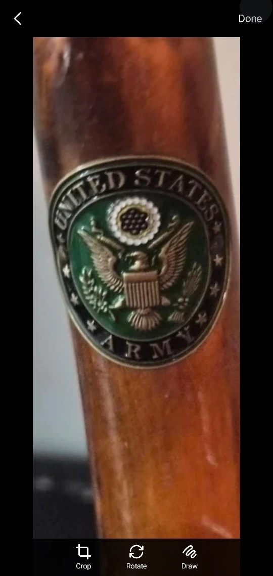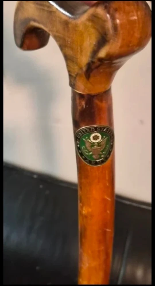 Here's a vintage walking cane featuring the United States Army emblem. It has a wooden finish and a unique handle design. Perfect for collectors or anyone looking for a distinctive walking aid!