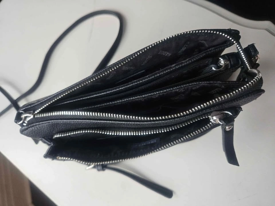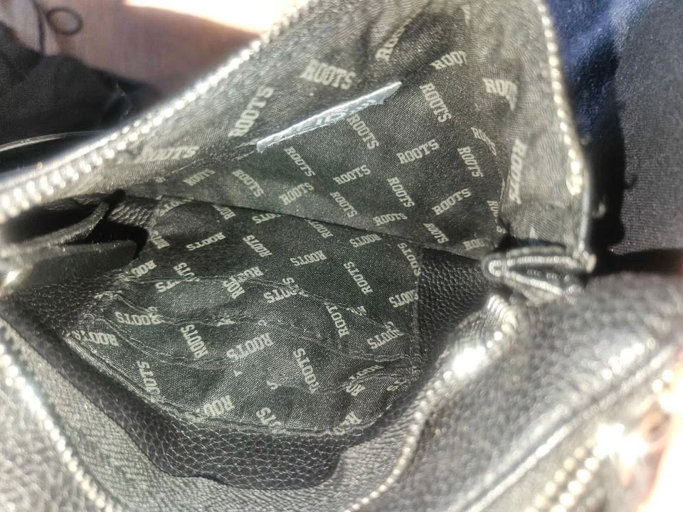 Roots black leather crossbody. Used but in good condition. Has 1 little tear on front, shown in the last photo. Has RFID protection, as well as many pockets/compartments and a few slots for cards too.
