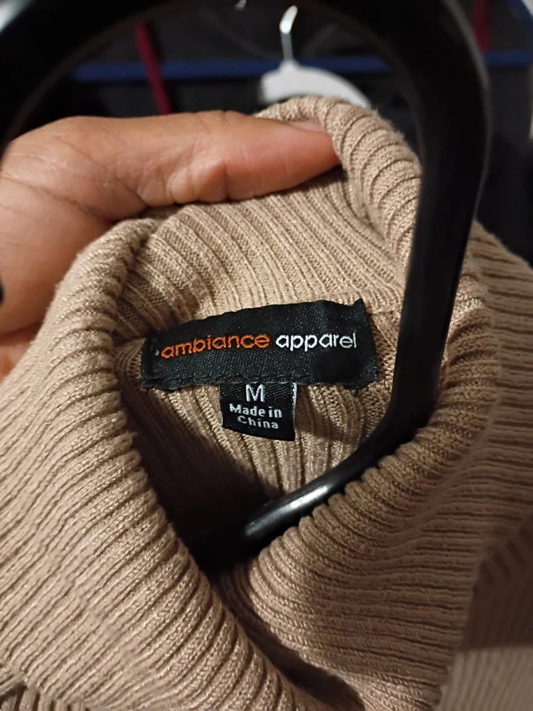 Thick beige turtleneck. Size Medium, but fits perfectly for size small.