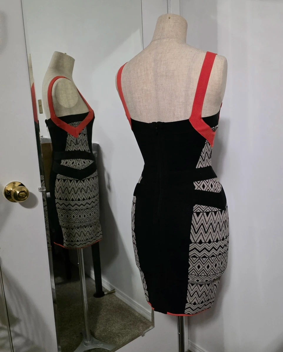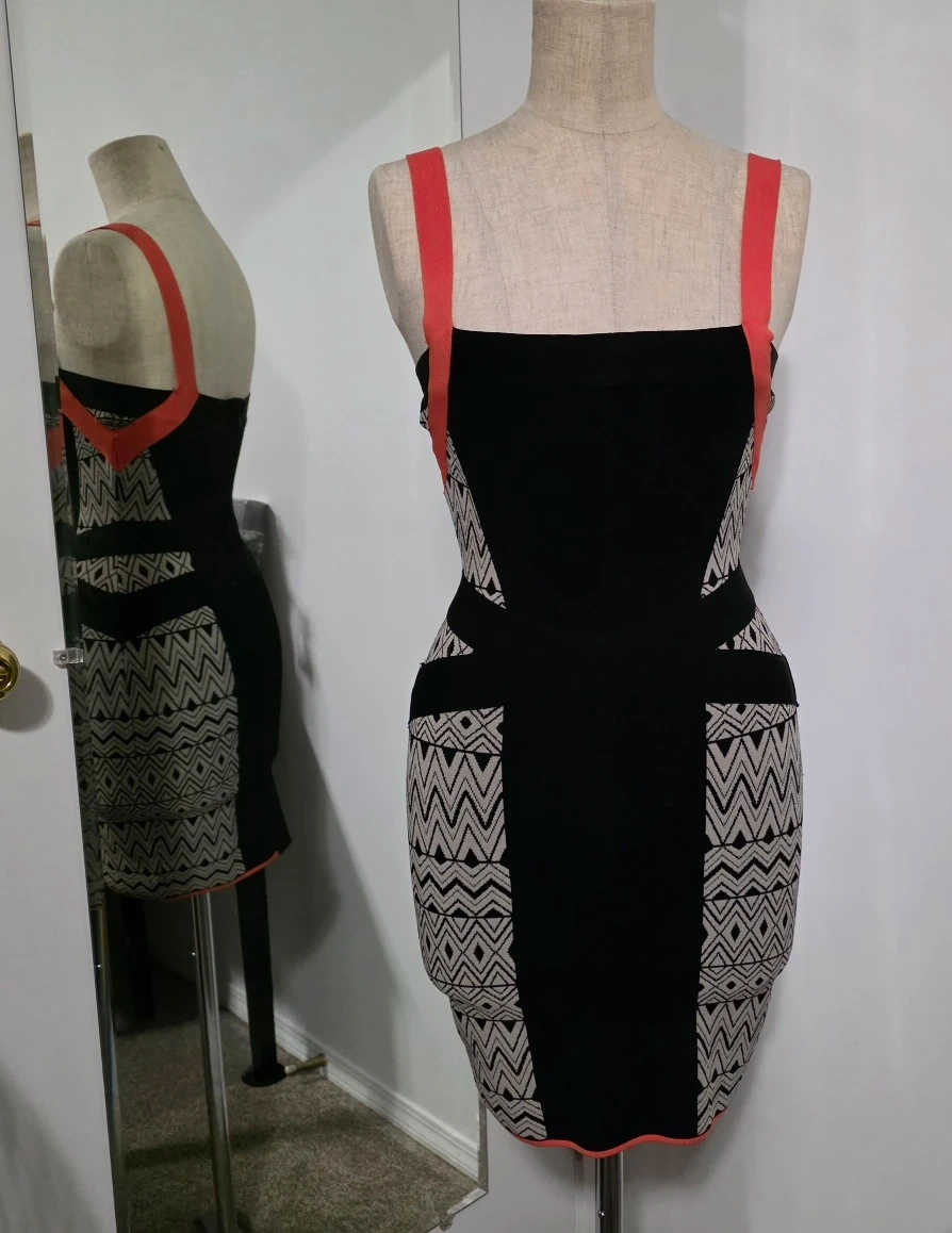 Selling a Guess by Marciano dress in size extra small! It's black with a unique geometric pattern and coral straps. Perfect for a night out or a special occasion. Stretchable.