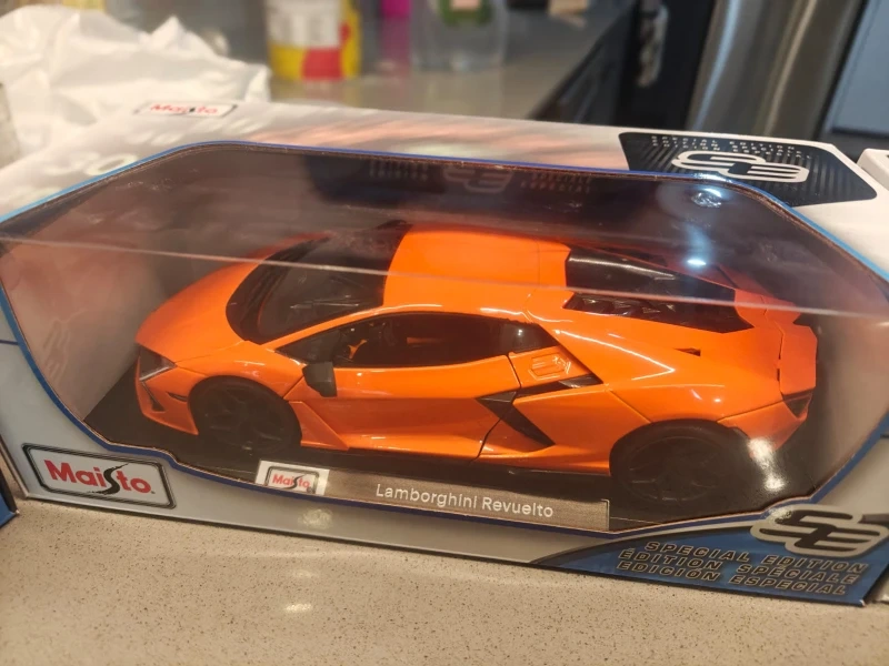 Selling a Maisto Lamborghini Revuelto model car in orange. It's in great condition and comes with the original box