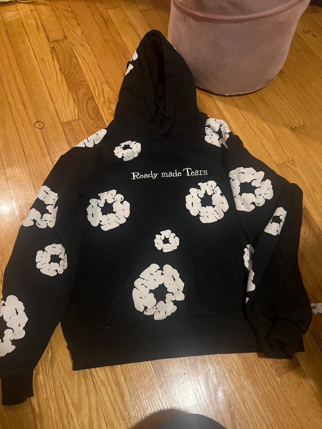 Selling a black hoodie with the text "Ready made Tears" and white floral designs. It's in great condition and ready for a new owner!