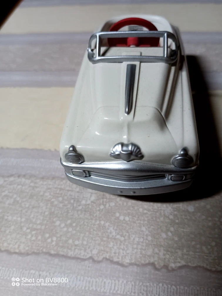 Selling a vintage Torpedo pedal car! It features a white body with a red steering wheel and seat. The wheels are red and white, adding to its classic look. A great piece for collectors or as a decorative item