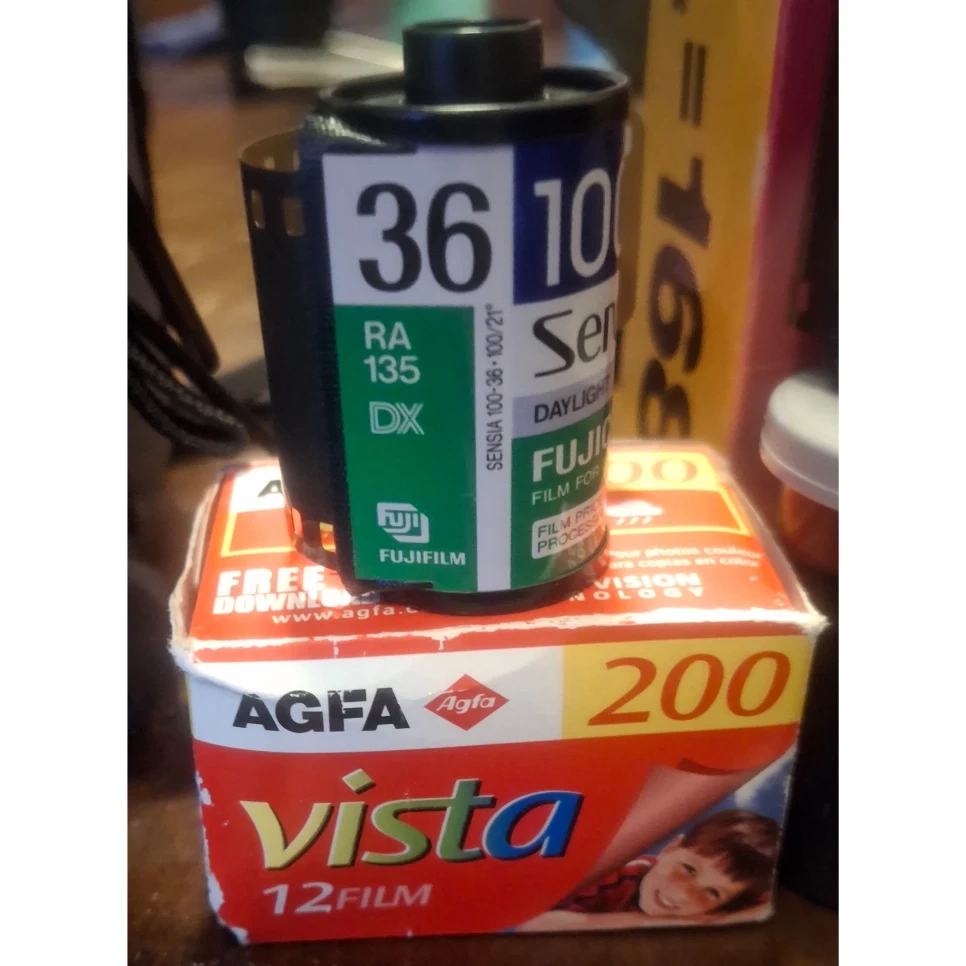 AGFA Vista 200: One roll is visible in a green box. This film was a popular, budget-friendly option known for vibrant colors and fine grain. It was discontinued around 2018.