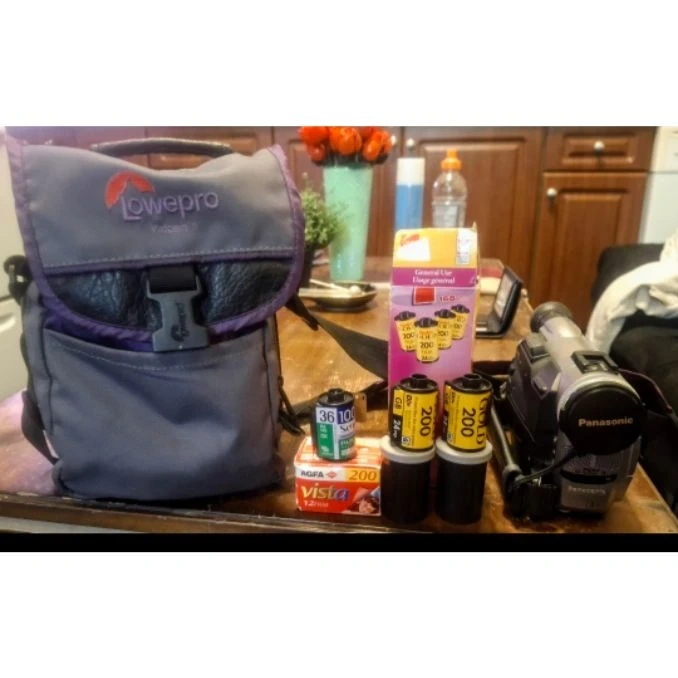 Here is a collection of vintage photography gear and film, including a camera bag, a camcorder, and film rolls.