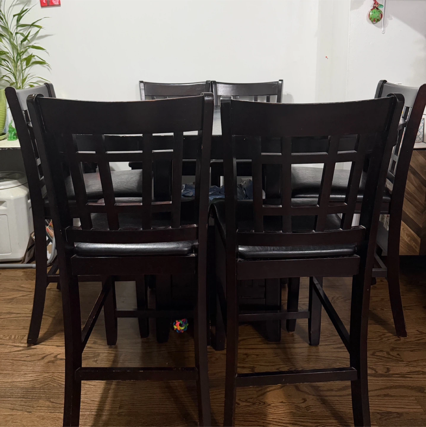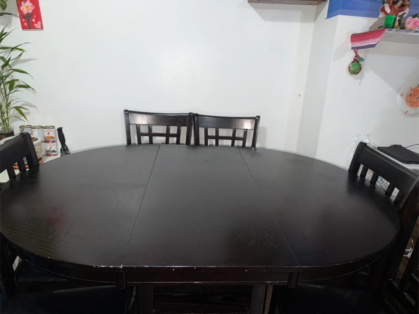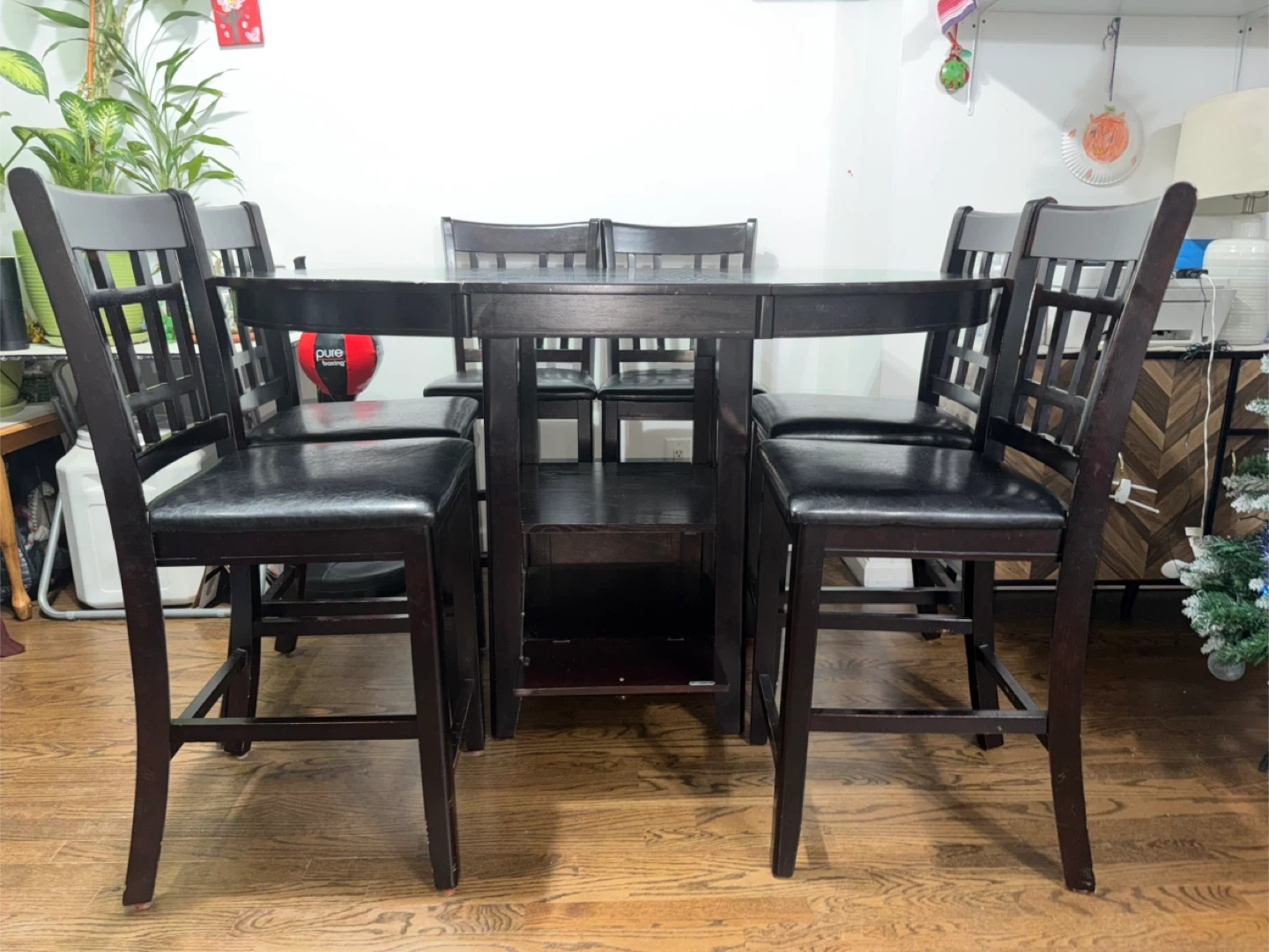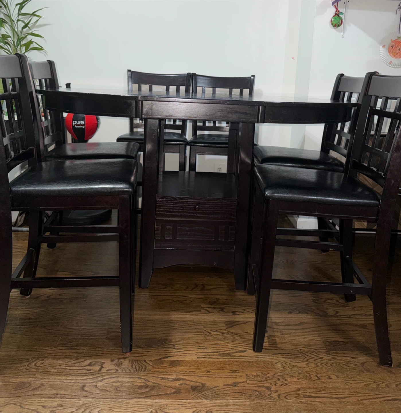 Dark wood dining table with six chairs. The chairs have black leather seats. The table has a storage shelf underneath. The middle part of the table can be removed & it turns into a round table too.
