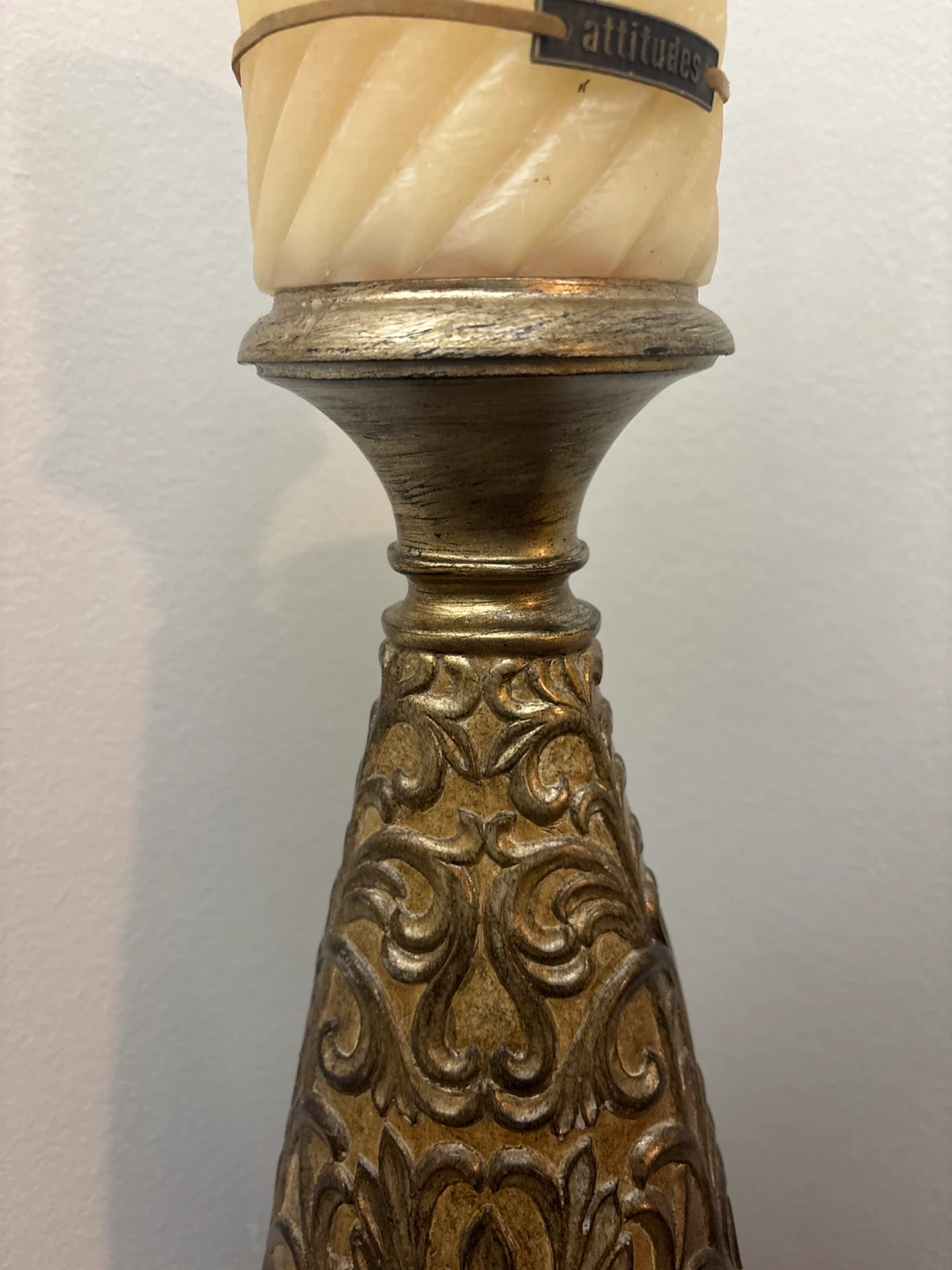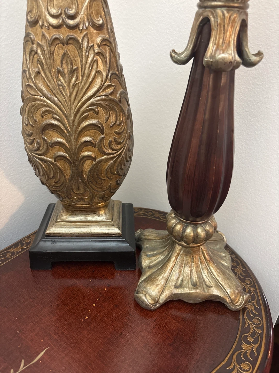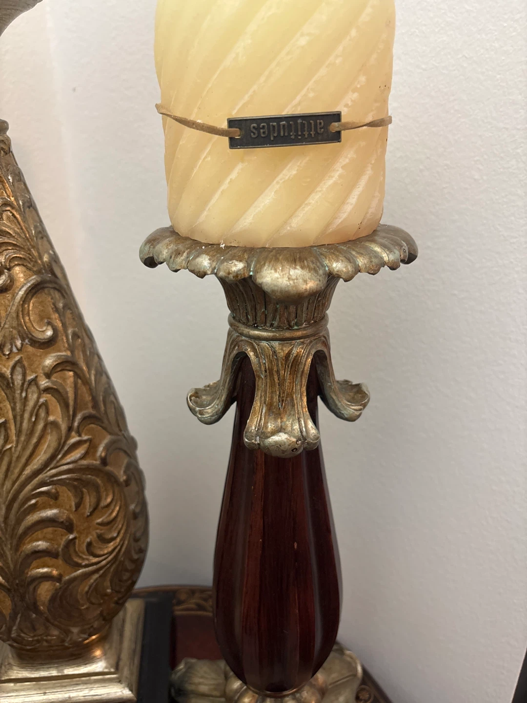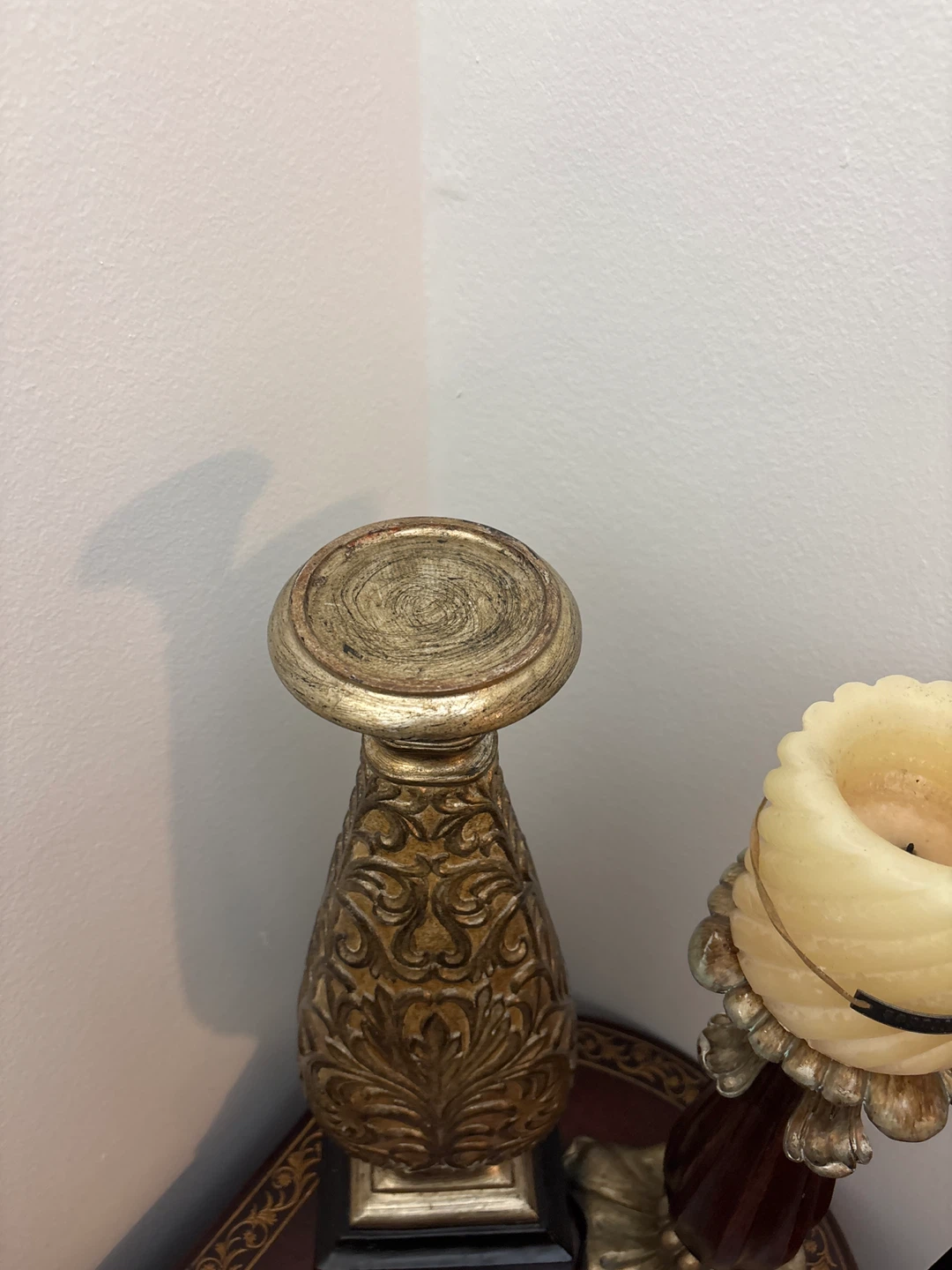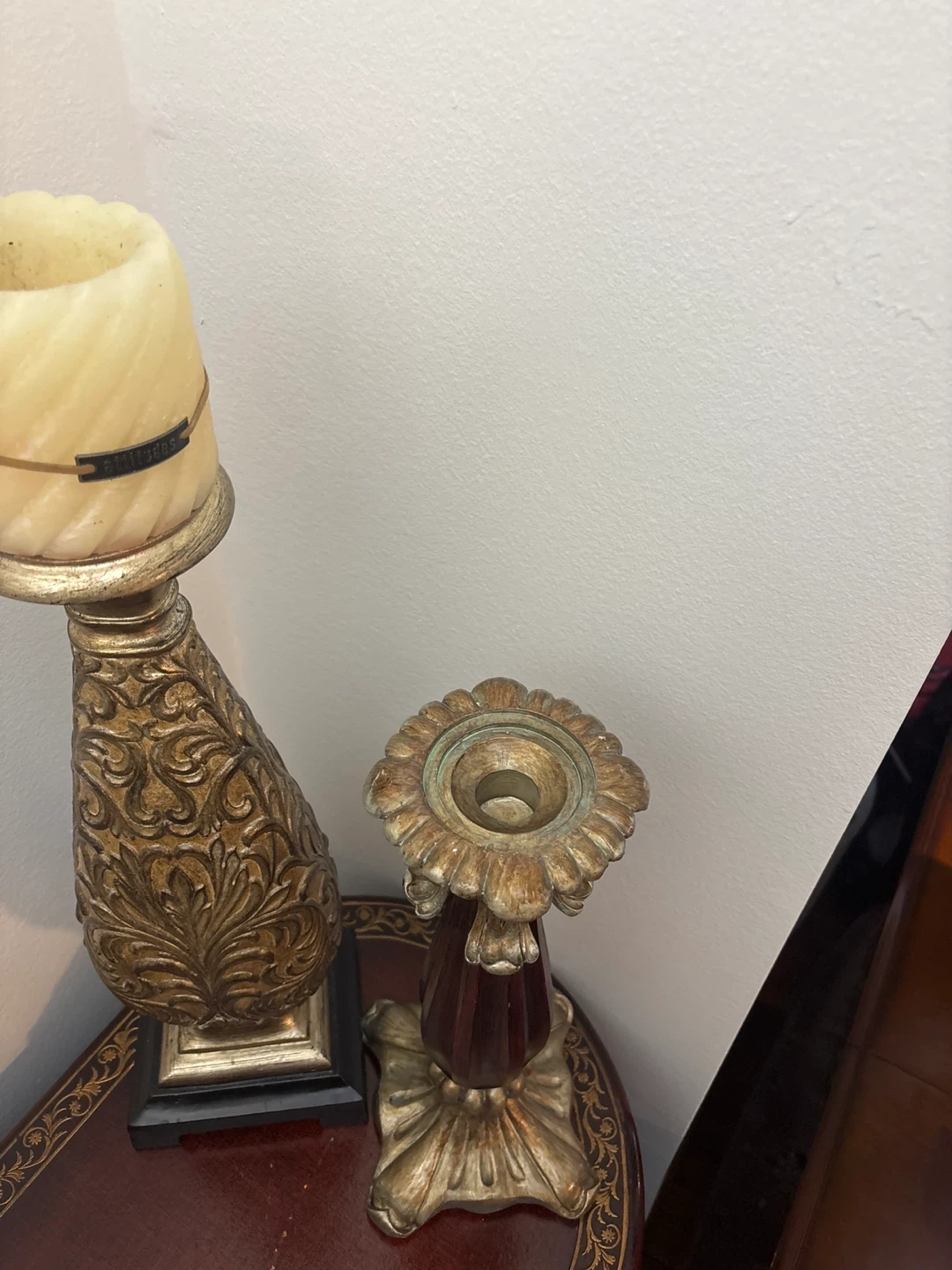 Selling a beautiful set of candle holders. One is gold with a leafy pattern. The other is wood and gold. They're perfect for adding a touch of elegance to any room