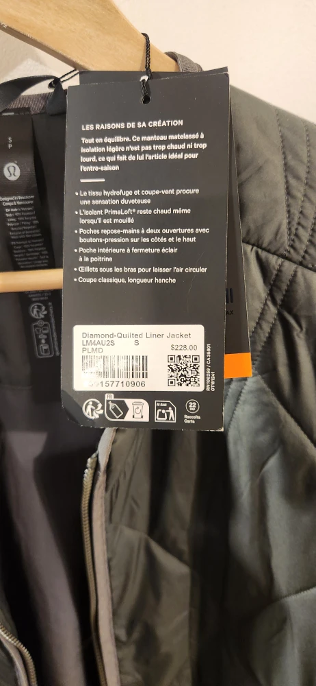 Selling a Lululemon Diamond-Quilted Liner Jacket in size small. It's brand new with tags. The tag mentions it was originally $228. It's designed in Vancouver and features PrimaLoft insulation to keep you warm even when wet. It also has hand pockets with hidden media and interior zippered pockets. Perfect for layering or wearing on its own! I have this in small also XXL I'm asking 125 each.