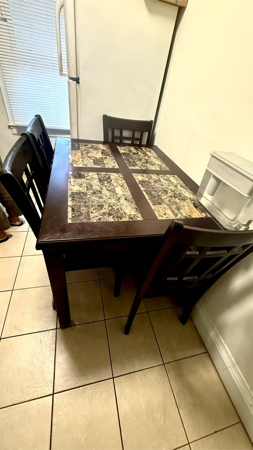 Selling a dining table with four matching chairs. The table has a dark wood finish with a faux marble tile inlay on the top. The chairs are also dark wood with a ladder back design. It's in good condition and ready for a new home!