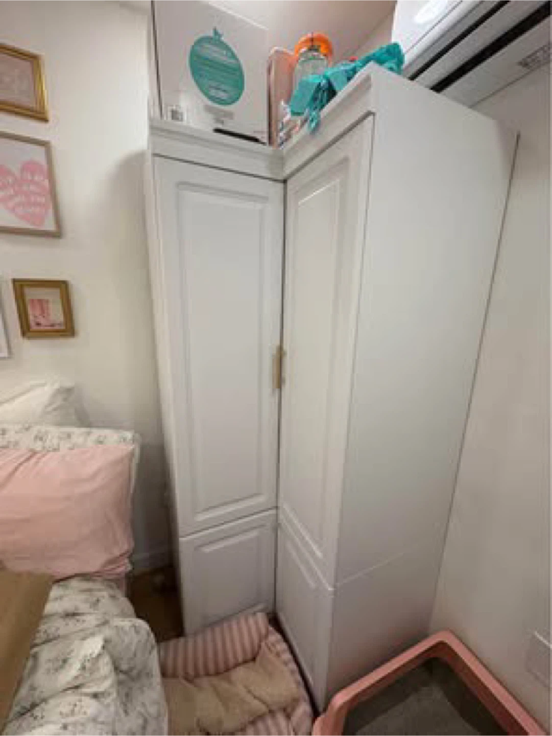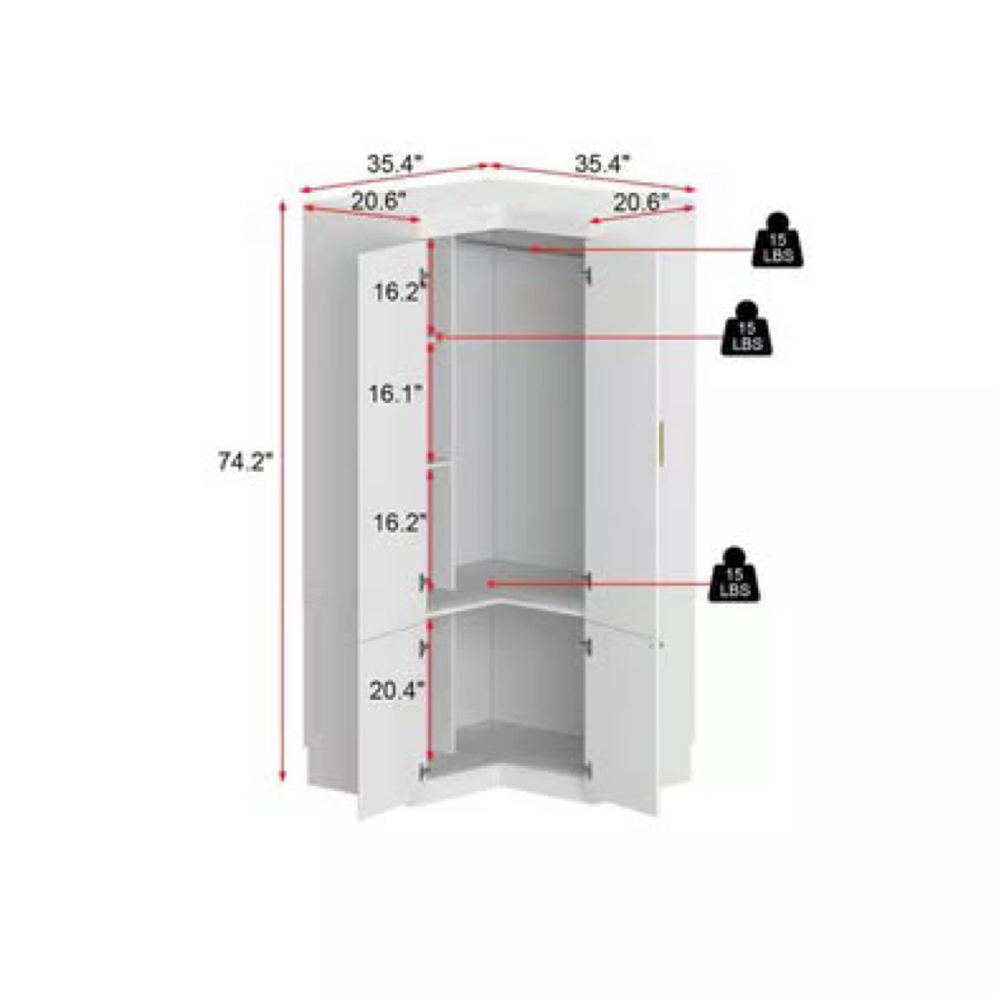 This white corner wardrobe cabinet is perfect for maximizing space in your room. The dimensions are approximately 74.2" tall, with sides measuring 35.4" and depths of 20.6". Each shelf can hold up to 15 lbs. It's in great condition and ready to use! Paid $500 and $100 to get it professionally assembled. Pickup in the east village. One floor walk up. You will need to get it out of my room.