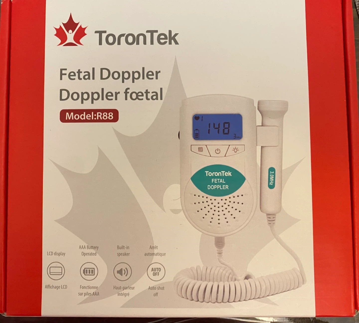 Selling a ToronTek Fetal Doppler, model R88. It's in like-new condition and comes with the box and all original components. It features an LCD display, operates on AAA batteries, and has a built-in speaker. Also includes ultrasound transmission gel.