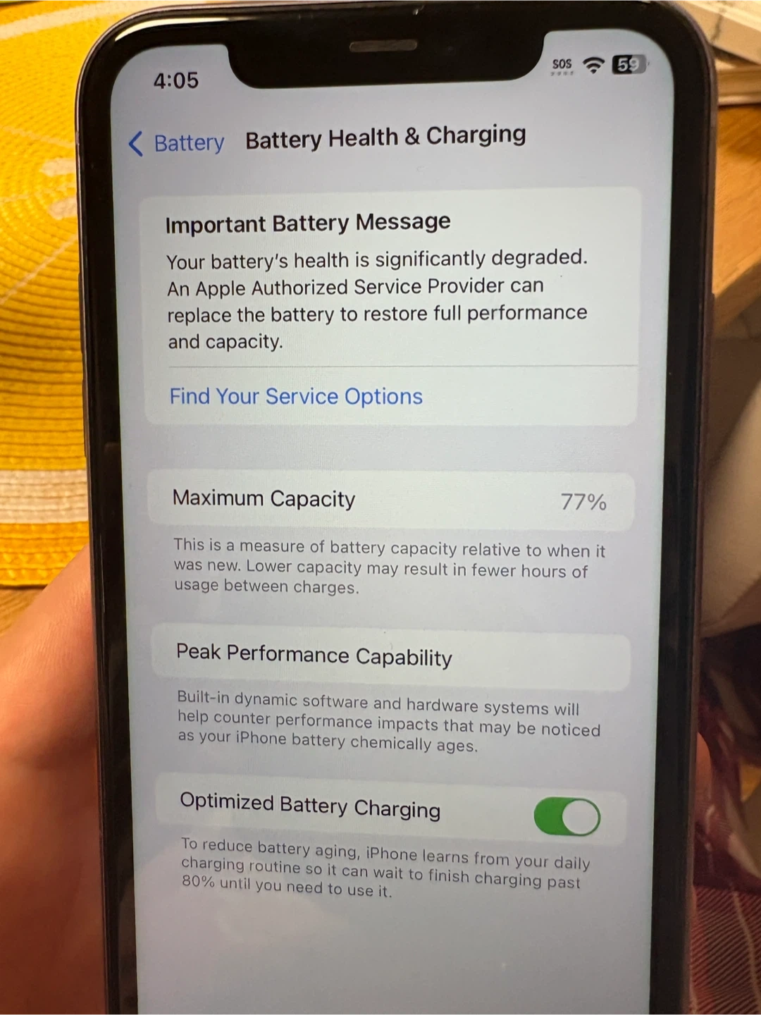 Purple iPhone 11. The battery health is at 77%, other than that it’s an excellent condition no cracks or chips perfect for a secondary phone or first-time user. 64 BG. Comes with charging cord and a case.