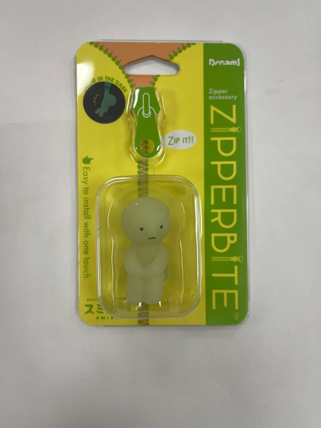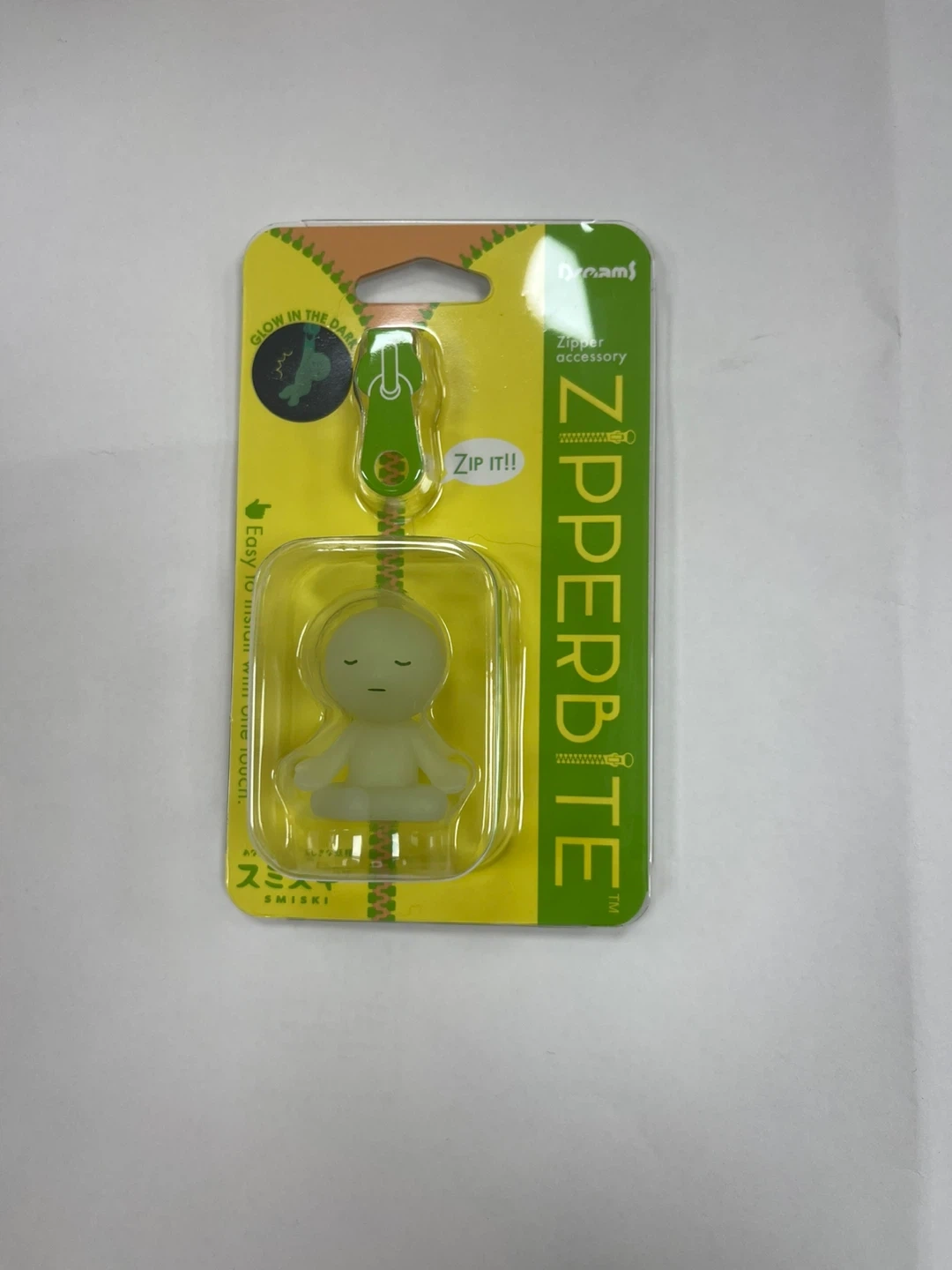 Check out this cute Dreams Smiski Zipperbite! It's a fun zipper accessory that glows in the dark. Easy to install with one touch, perfect for adding a little personality to your zippers