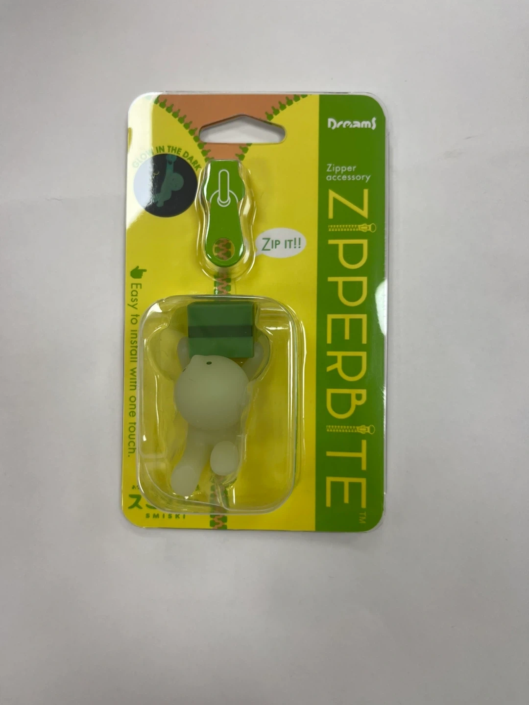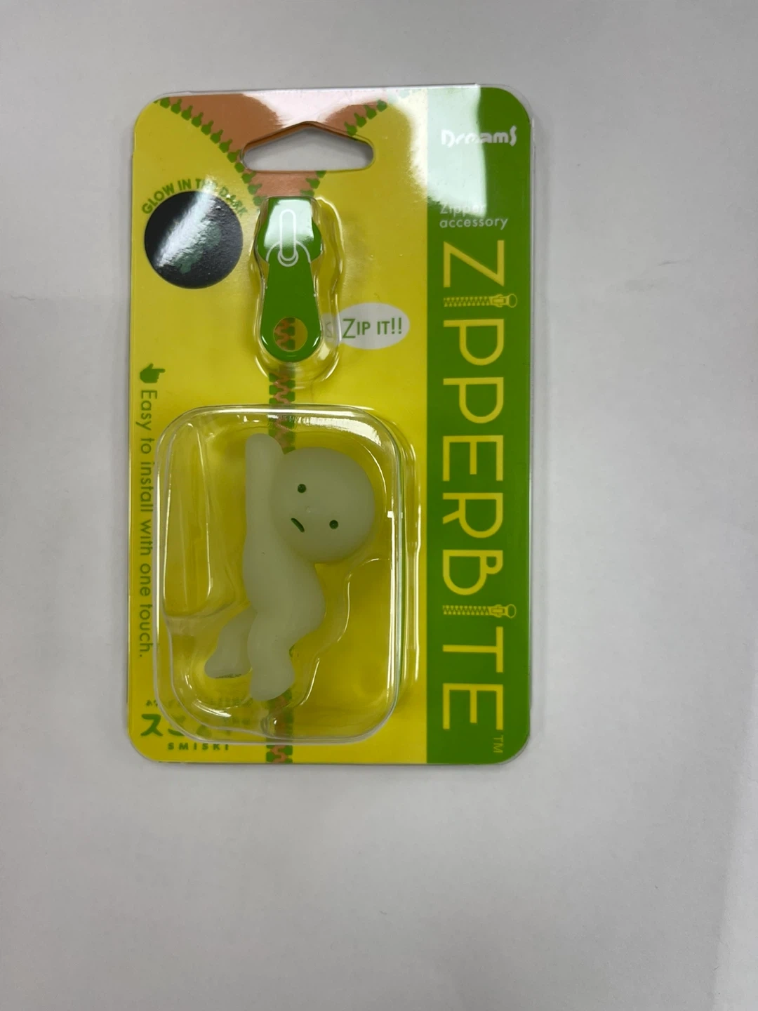Check out this cute Dreams Smiski Zipperbite! It's a fun zipper accessory that glows in the dark. Easy to install with one touch, perfect for adding a little personality to your zippers