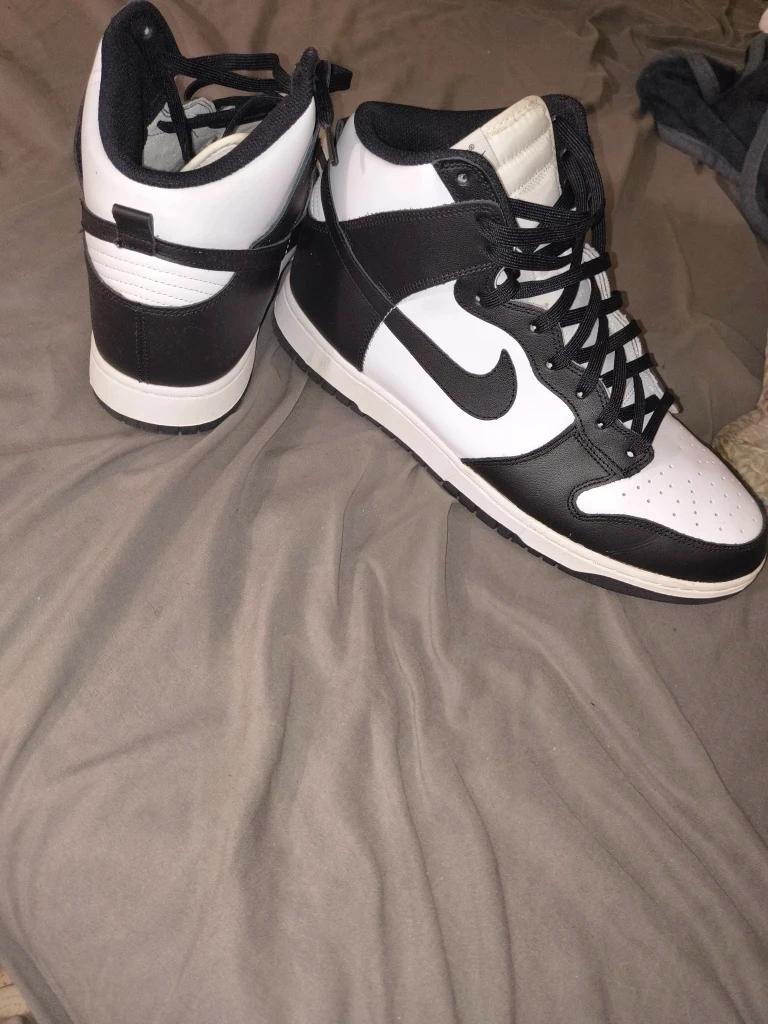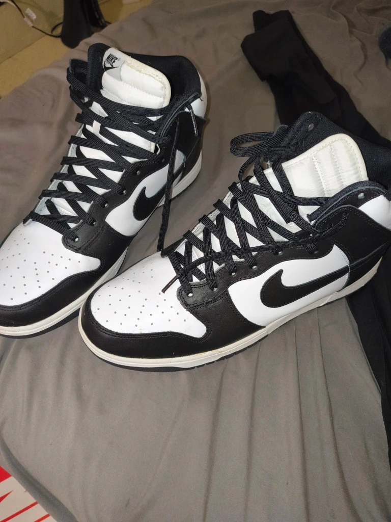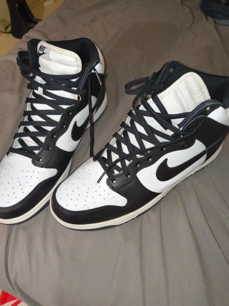 Selling a pair of Nike Dunk Hi Retro sneakers in a classic white and black colorway. These are a size 13. Check out the photos for the condition!