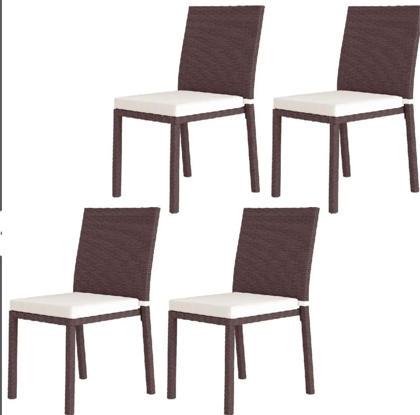 Here's a set of 4 dining chairs, perfect for your patio or dining room! They feature a brown wicker design and comfy white cushions. They're in great shape and ready to add some style to your space