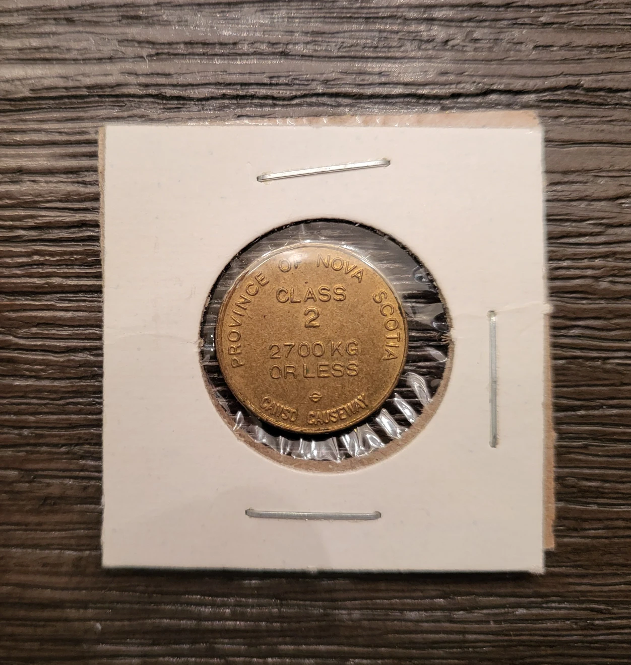 Vintage Nova Scotia Causeway toll token for vehicles of Class 2, 2700 kg or less.