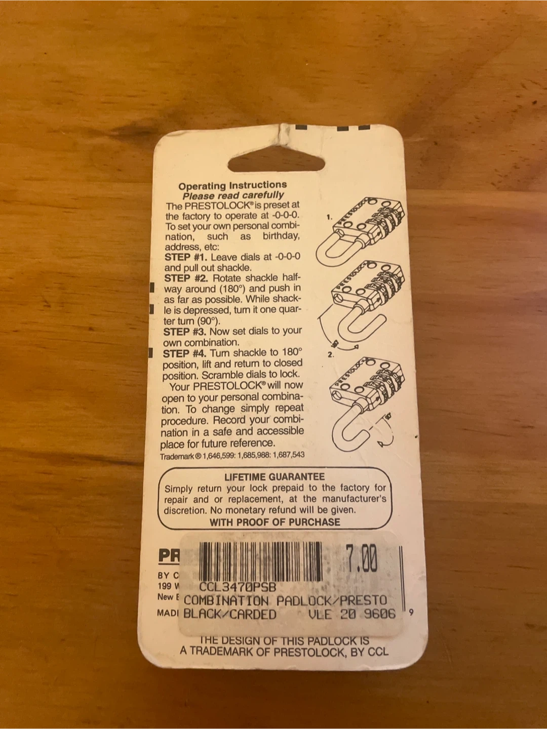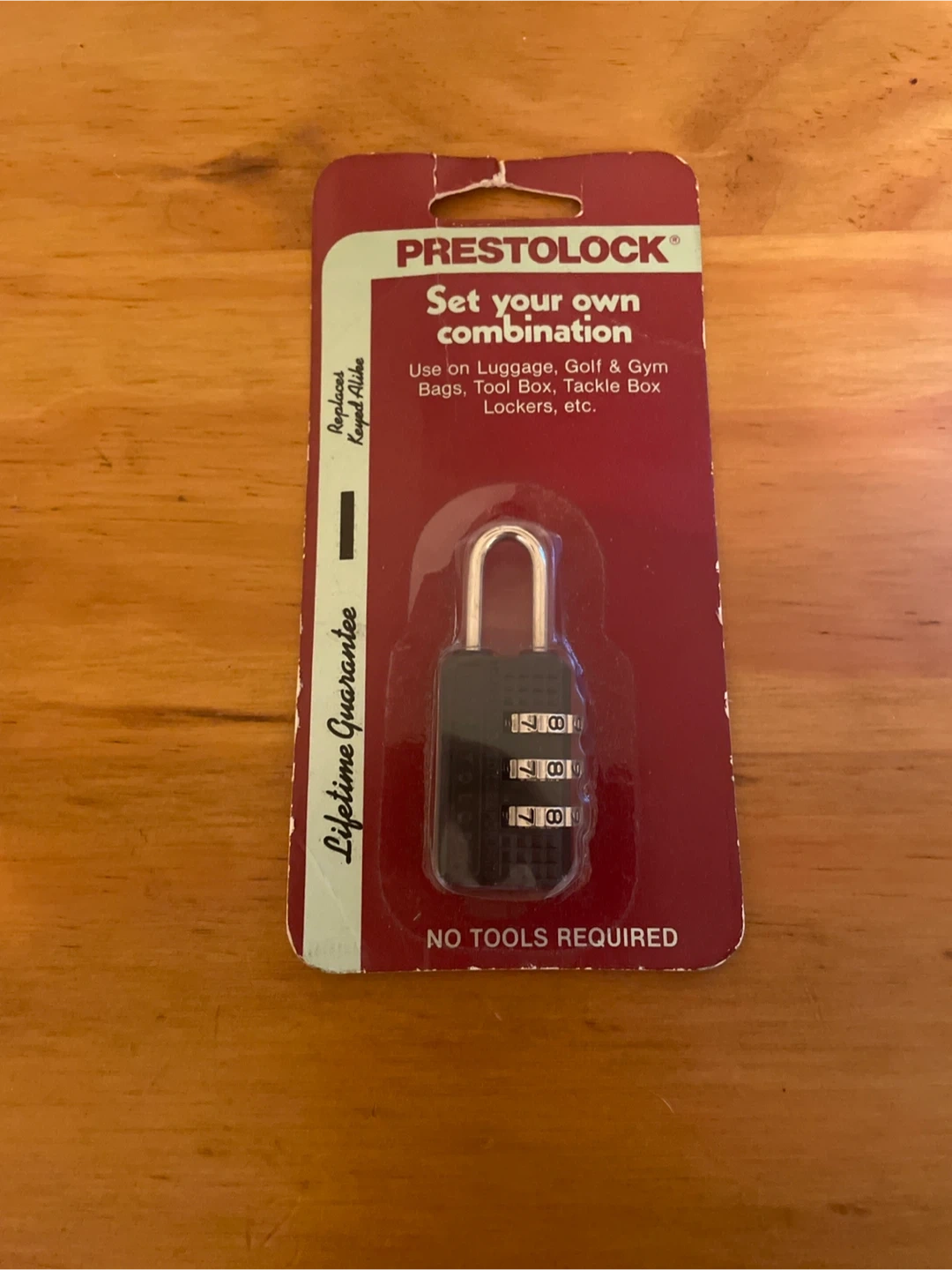 Selling a brand new Prestolock combination padlock, still in its original packaging! This padlock is perfect for securing luggage, golf and gym bags, tool boxes, tackle boxes, and lockers. No tools are required to set your own combination. The back of the package includes operating instructions and information about the lifetime guarantee. It was originally priced at $7.00.