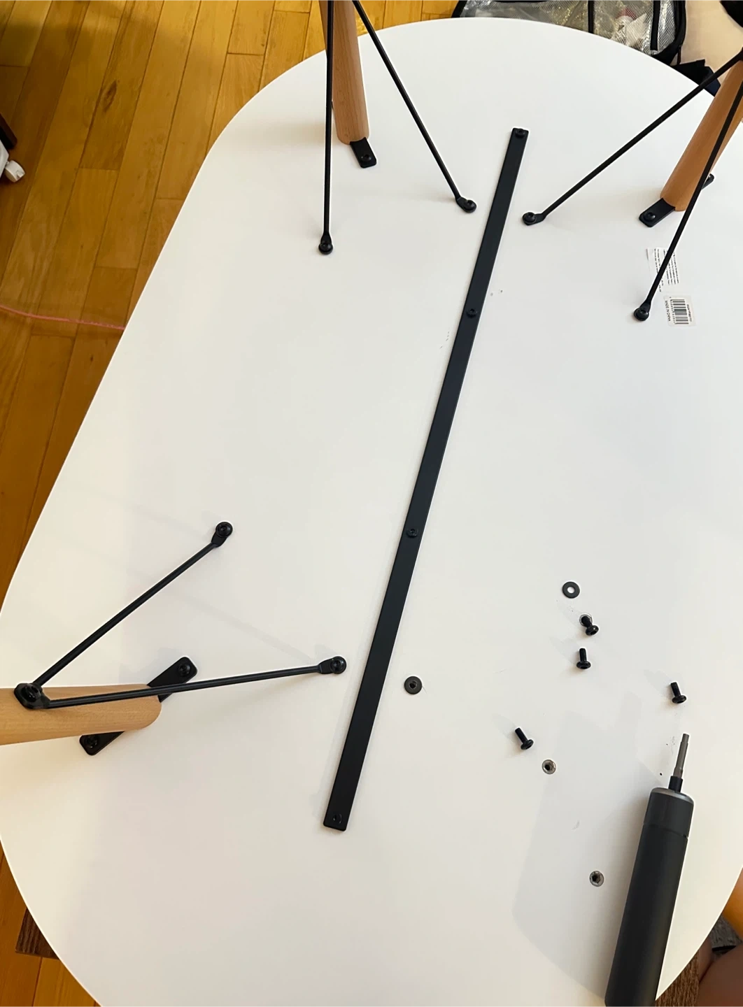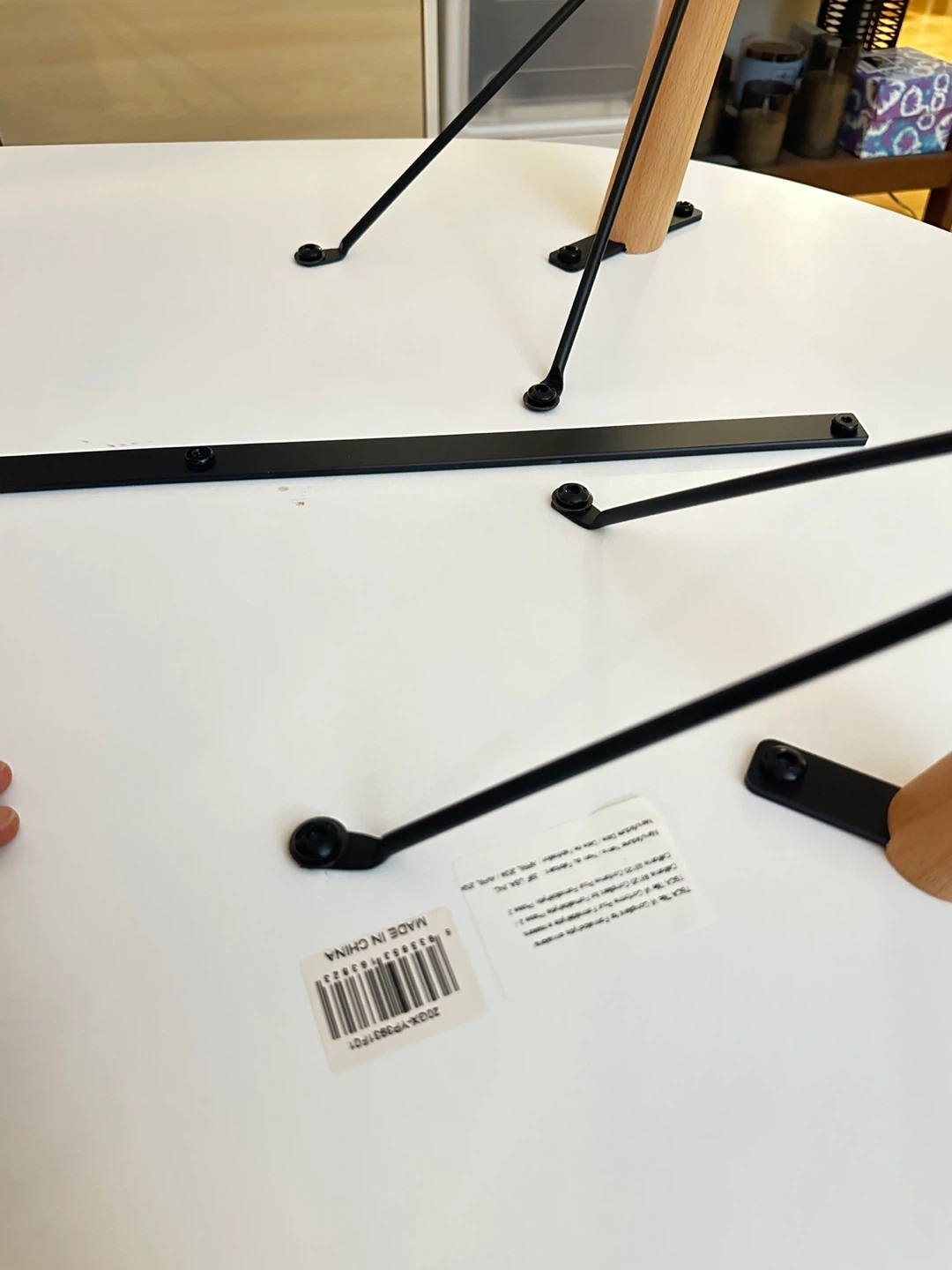 On bottom: We took off legs so it doesn’t take space in our home right now FYI, but we have all the screws/washers & we’ll also give you the hex wrench that fits! :)