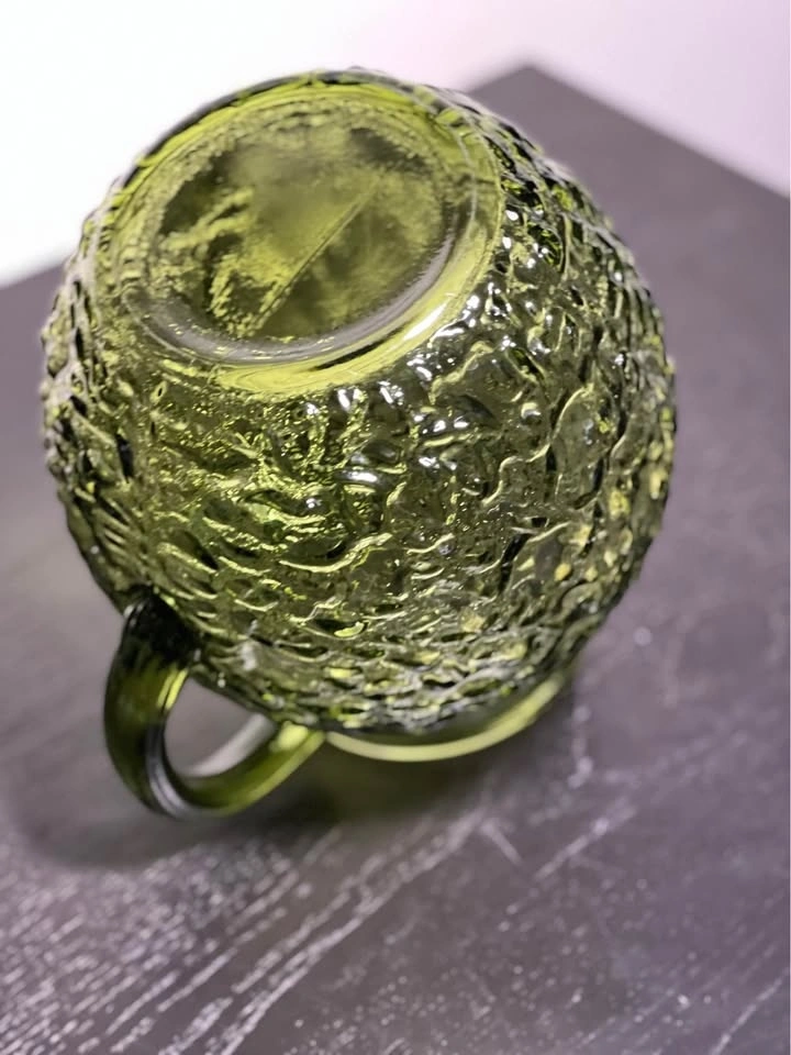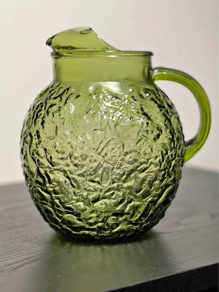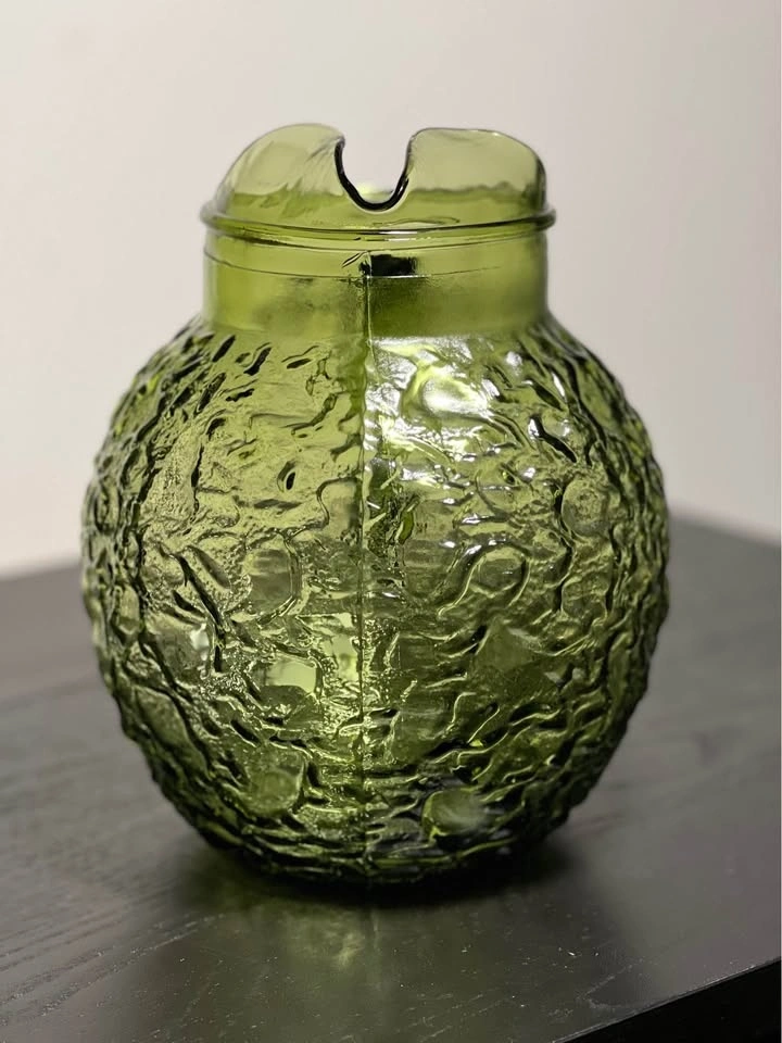 The item is a vintage Anchor Hocking Lido Milano ball pitcher in avocado green glass. This mid-century modern piece is known for its distinctive crinkled, textured design.