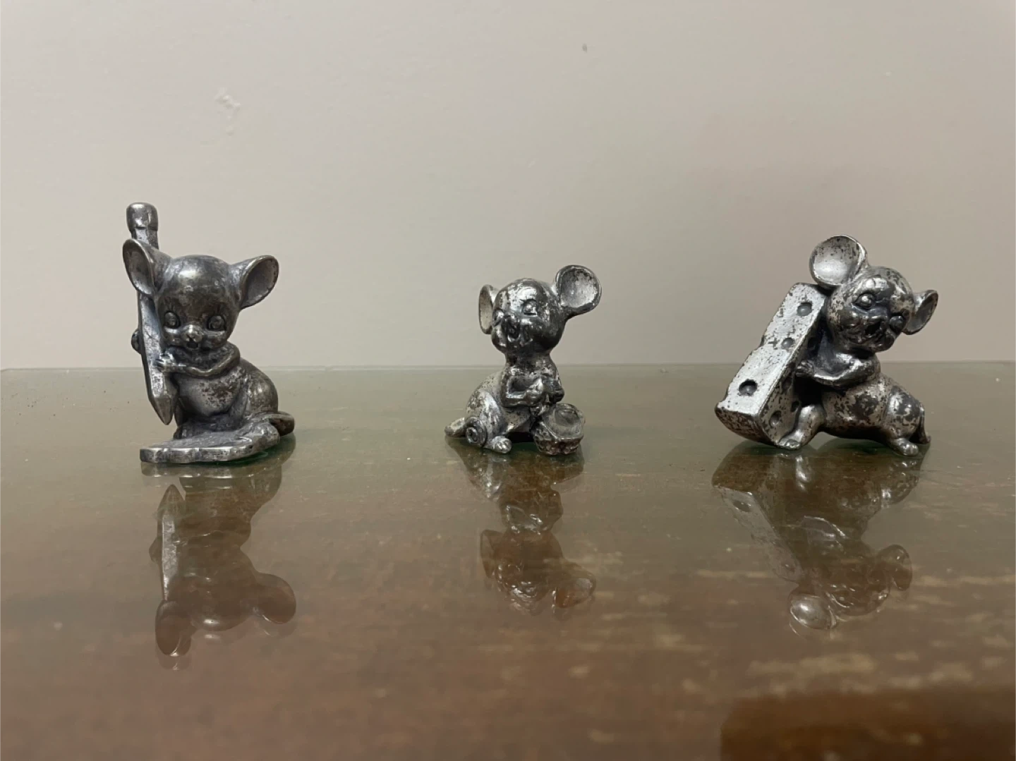 Here's a set of three vintage mouse figurines! They're made of metal and have a charming, antique look. These would be a cute addition to any collection or as decorative pieces around the house