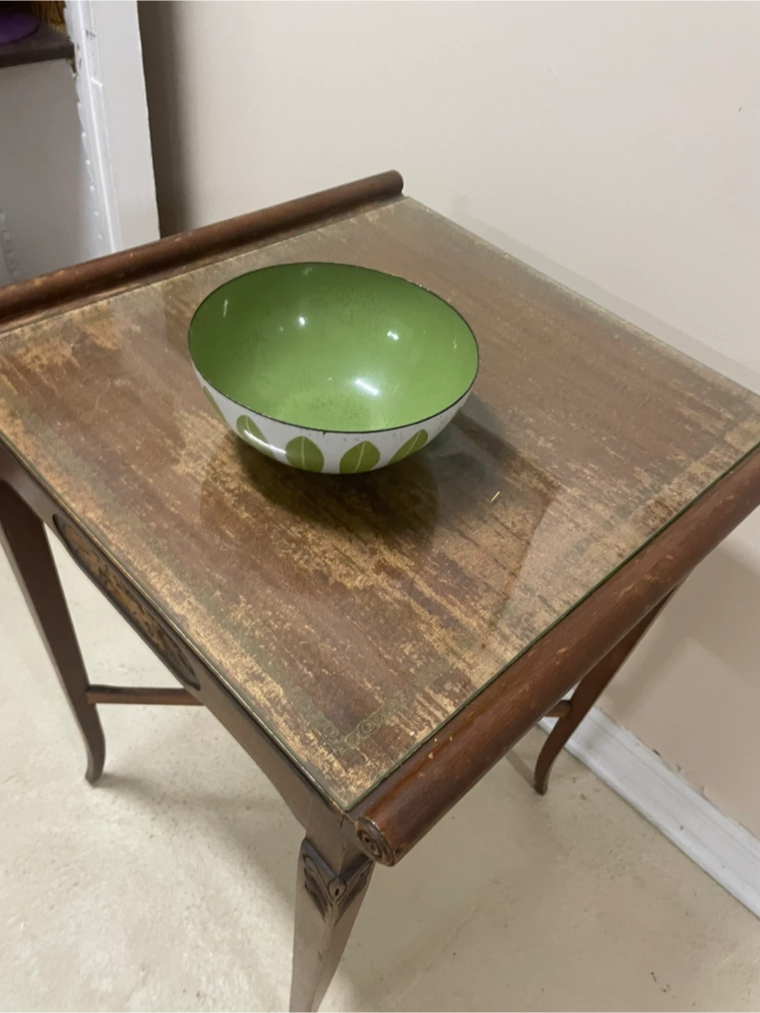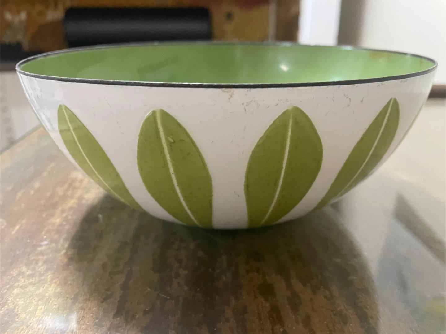 Here's a lovely green and white decorative bowl! It would look great as a centerpiece or accent piece in any room. It's in good condition and ready for a new home