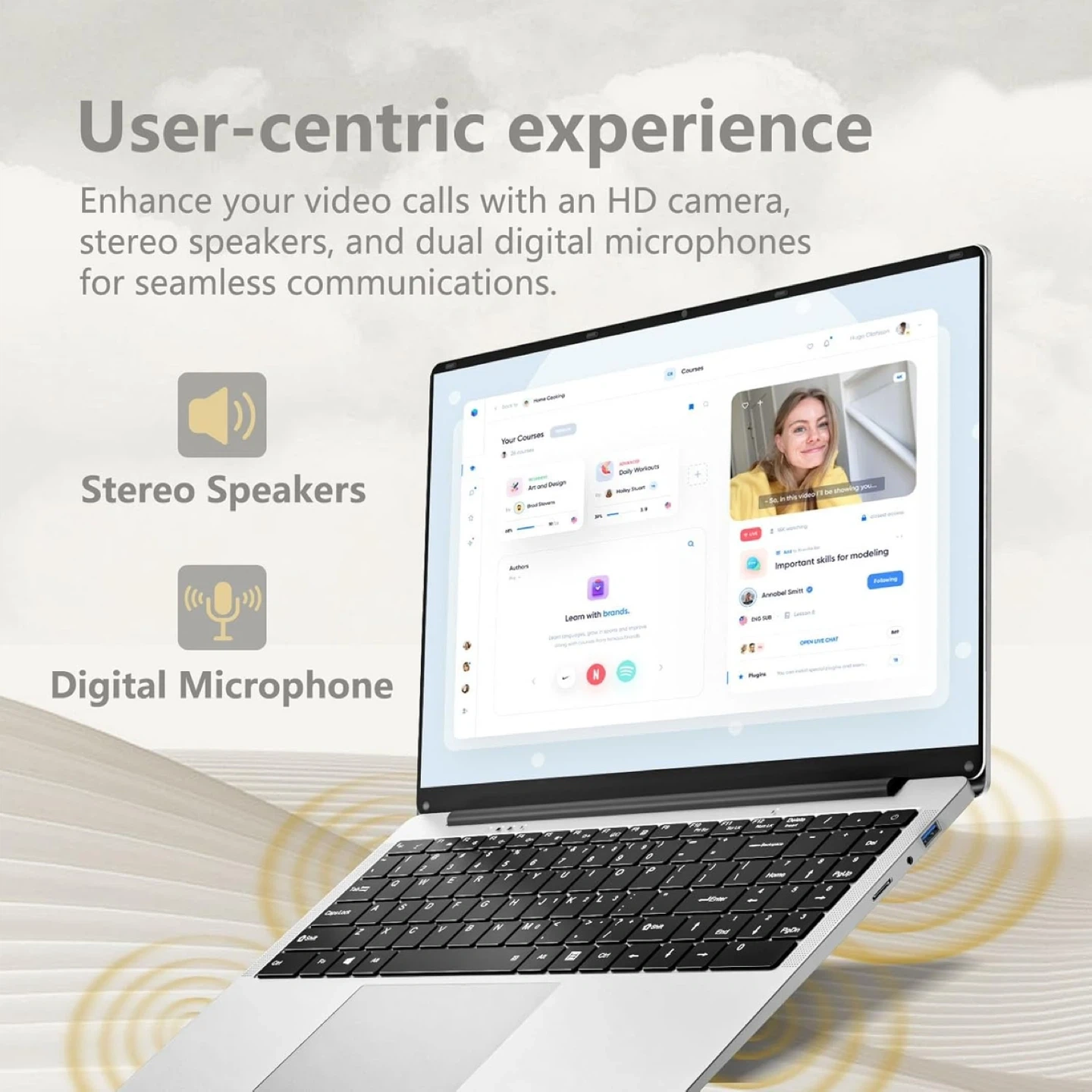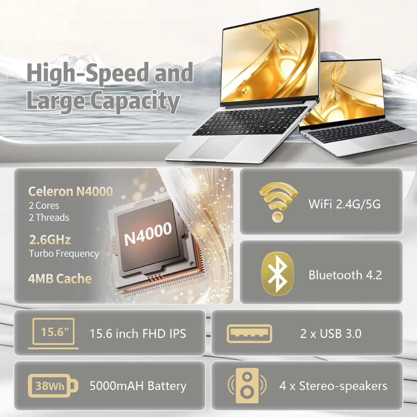 Selling a laptop with a 15.6 inch FHD IPS display. It features a Celeron N4000 processor, 12GB of RAM, and 256GB of ROM. It also has Wifi 2.4G/5G and Bluetooth 4.2. It also has stereo speakers and a digital microphone for seamless communications